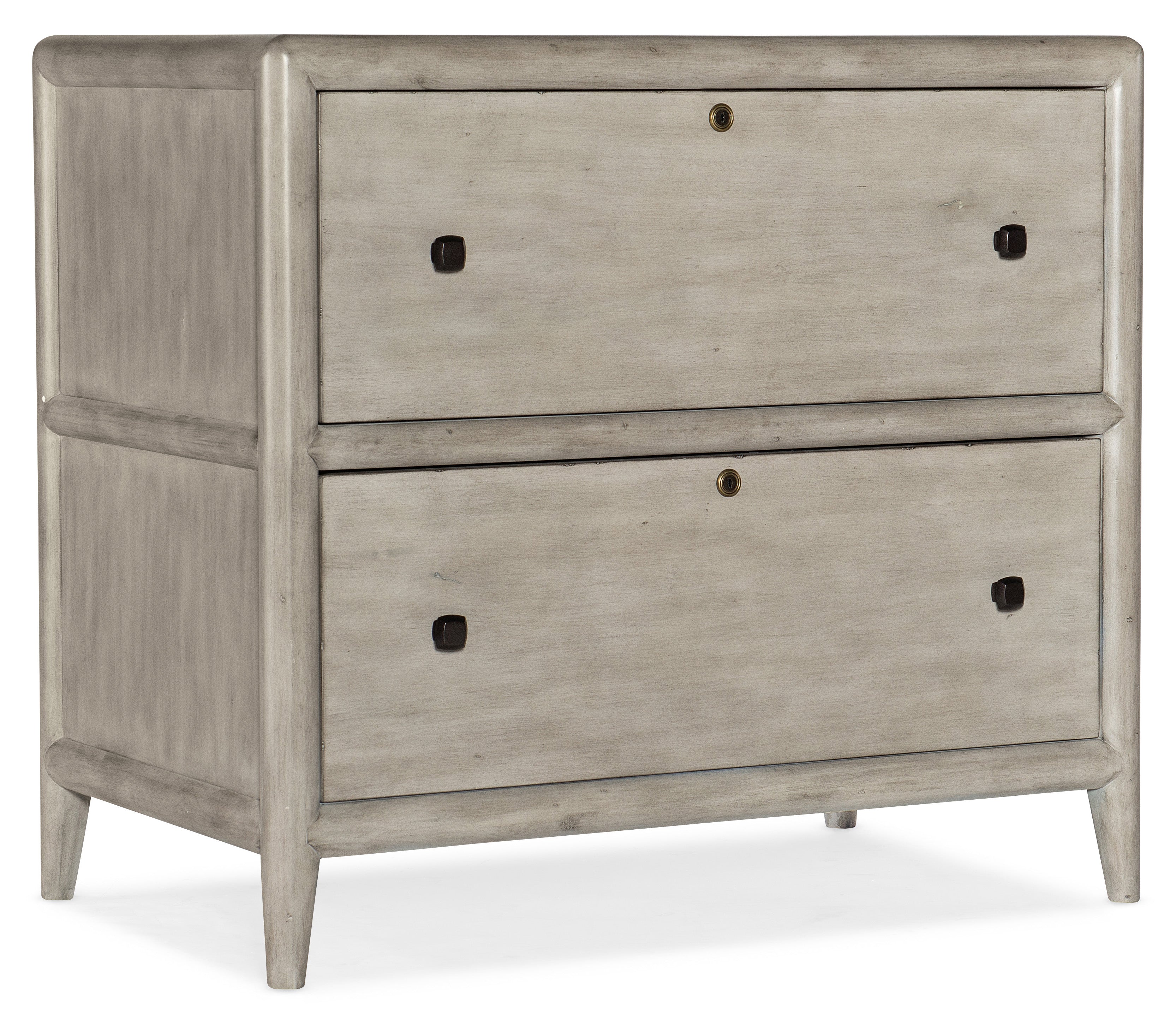 With a soft modern and casual appeal, the Burnham Lateral File is crafted of Alder Veneers with knots in a Grey Mink finish accented by dark bronze knob hardware. This functional and versatile piece offers two locking file drawers with pendaflex filing system and locks on the front of the drawers. The drawers are on metal ball bearing full-extension slides.