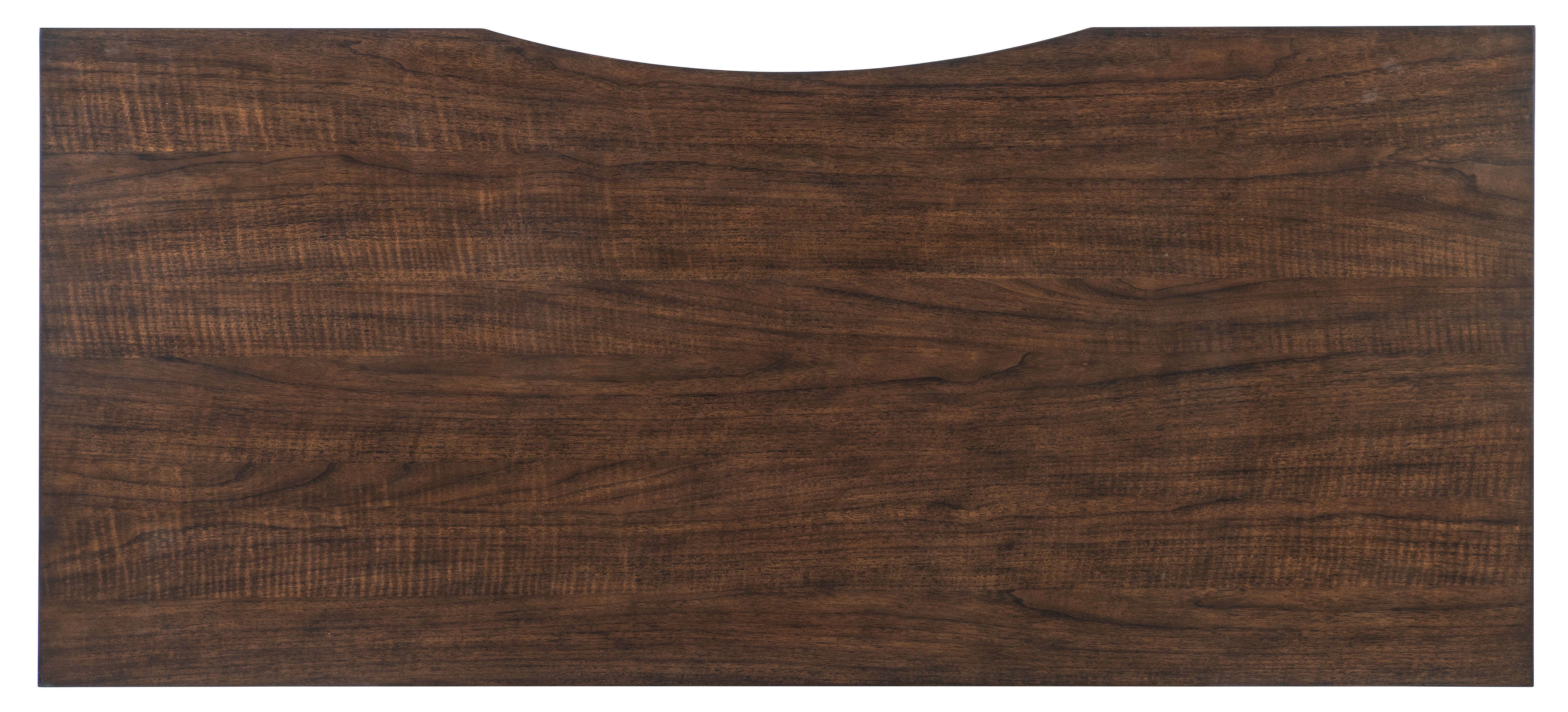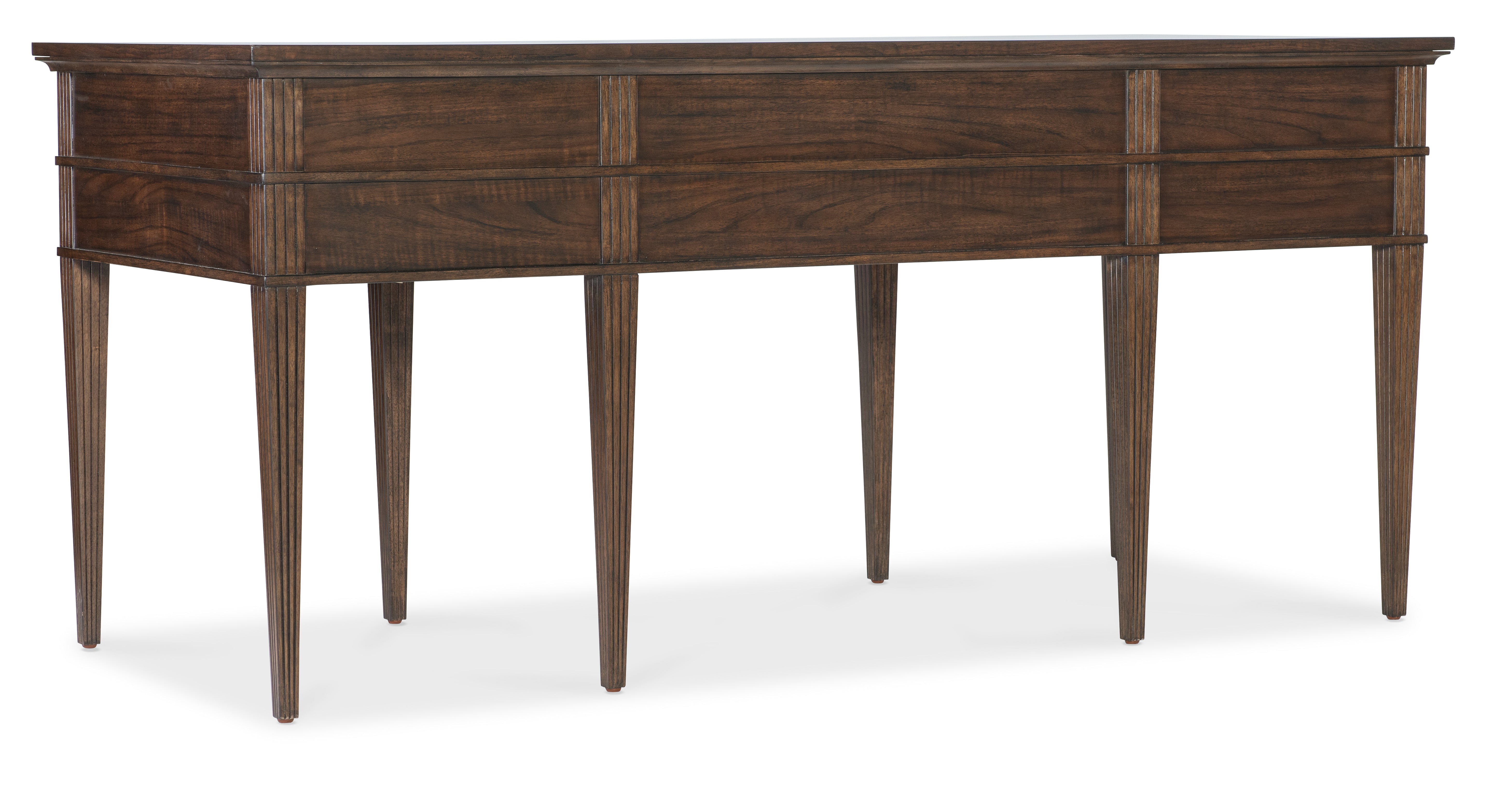A timeless European-inspired desk silhouette crafted of Figured Walnut Veneers is accented by transitional gold-colored square knobs to create a stylistically versatile piece. Featuring carved tapered legs and accents, the five drawers include left and right top drawers with removable/interchangeable writing surface and pencil tray. Each of the top drawers has two removable partitions. The center drawer has a drop-front writing surface and wire management. Two bottom utility drawers.