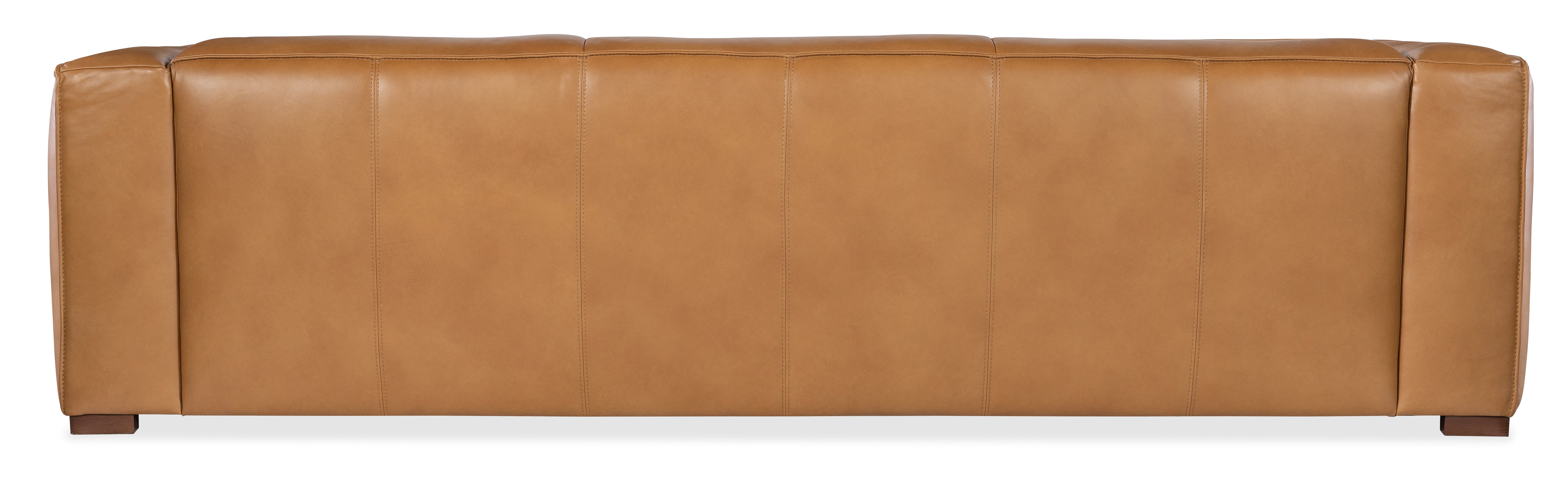 A sleek, low-profile silhouette with wide track arms, wood block feet and flange welt trim are paired with a warm and inviting caramel-colored luxurious semi-aniline leather cover in the 114-inch-wide Maria 3-seat Sofa.
