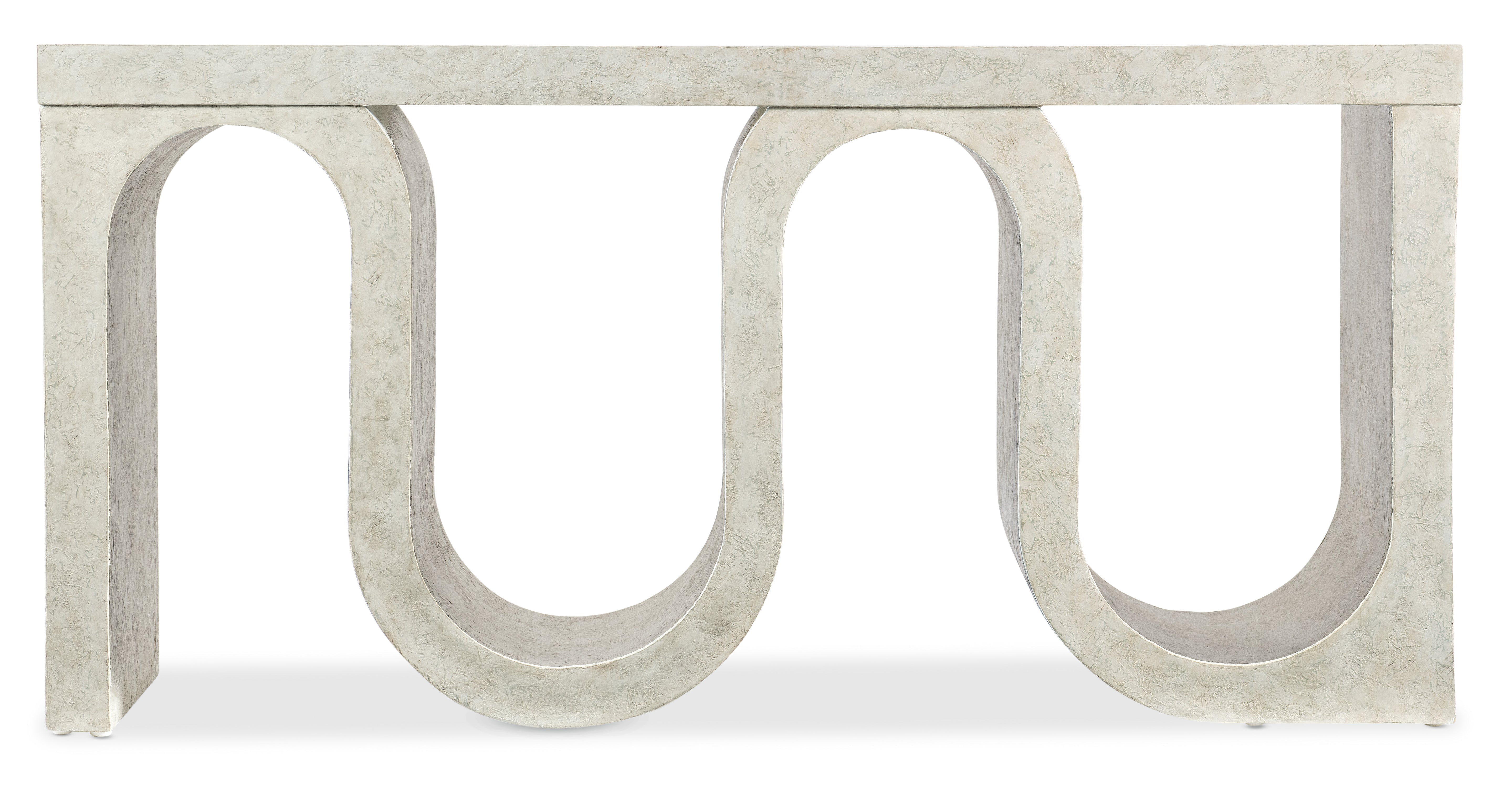 A cream-colored textured finish is paired with a curvy curled-ribbon-like base to create a narrow rectangle-shaped table that is chic, casual and tactile.