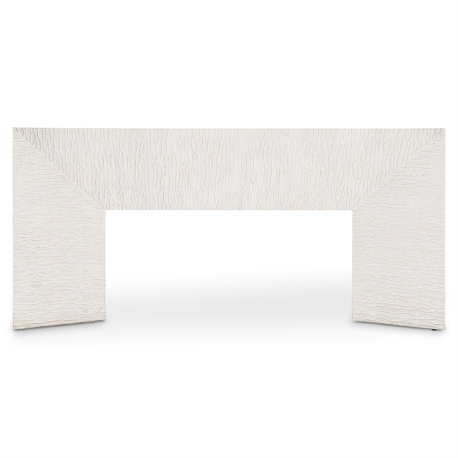 Appearing as if it were carved directly from a block of white stone, the Solaria console table offers simple lines elevated with a textural surface. Chiseled cast resin on the front and back creates an irresistible character, while the smooth white oak top and sides complement the elemental design. The result is a fundamental and modern study in contrasts.
