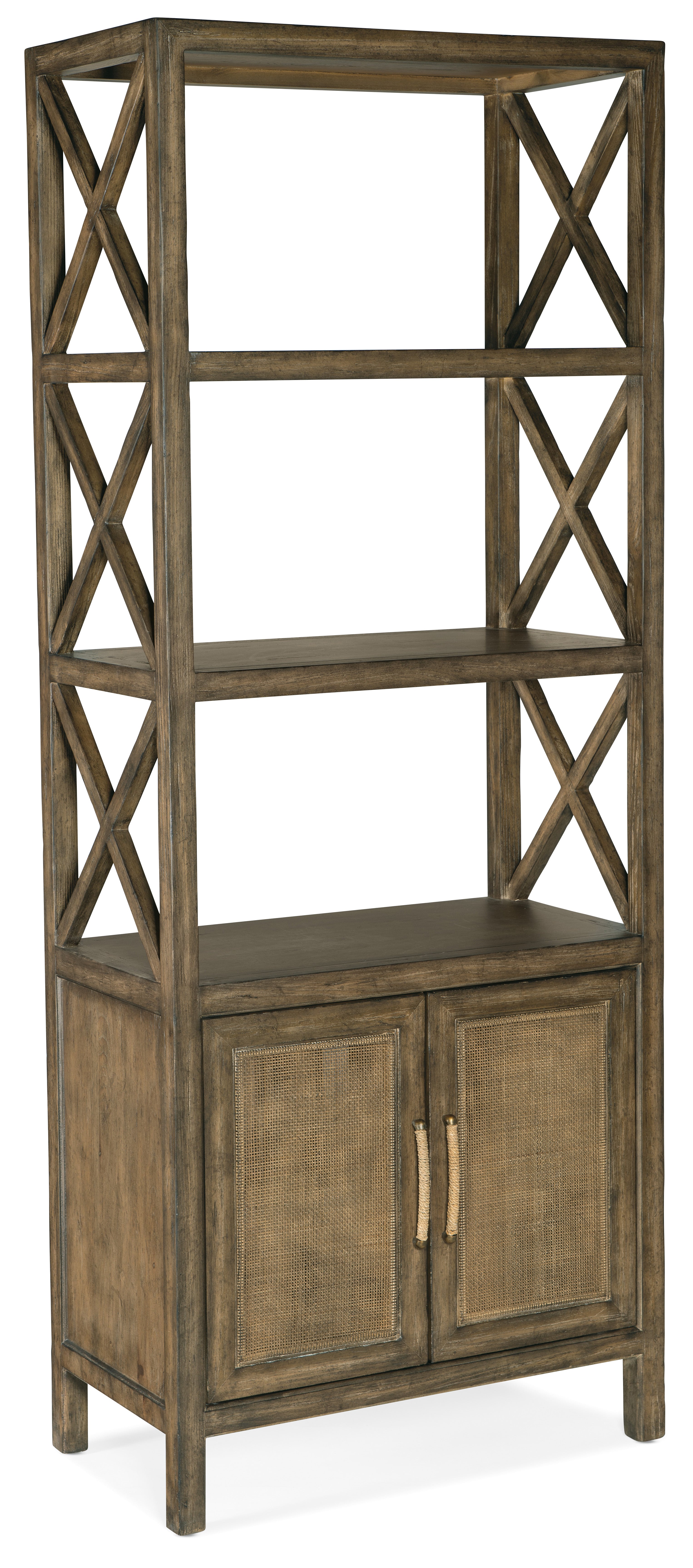 Create a resort-inspired retreat with the Sundance Entertainment Pier, featuring 2 rattan-front doors complementing a wood frame crafted of Pecan Veneers finished in the rich brown Cliffside with light burnishing on the edges. The laid-back vibe of this California casual-inspired piece is enhanced by X motifs on the sides of the shelves. Behind the doors is one adjustable vented shelf, and two fixed shelves. This piece is designed to bunch with coordinating with the 6015-55465-89 Sundance Entertainment Console full entertainment wall, and can be used alone.