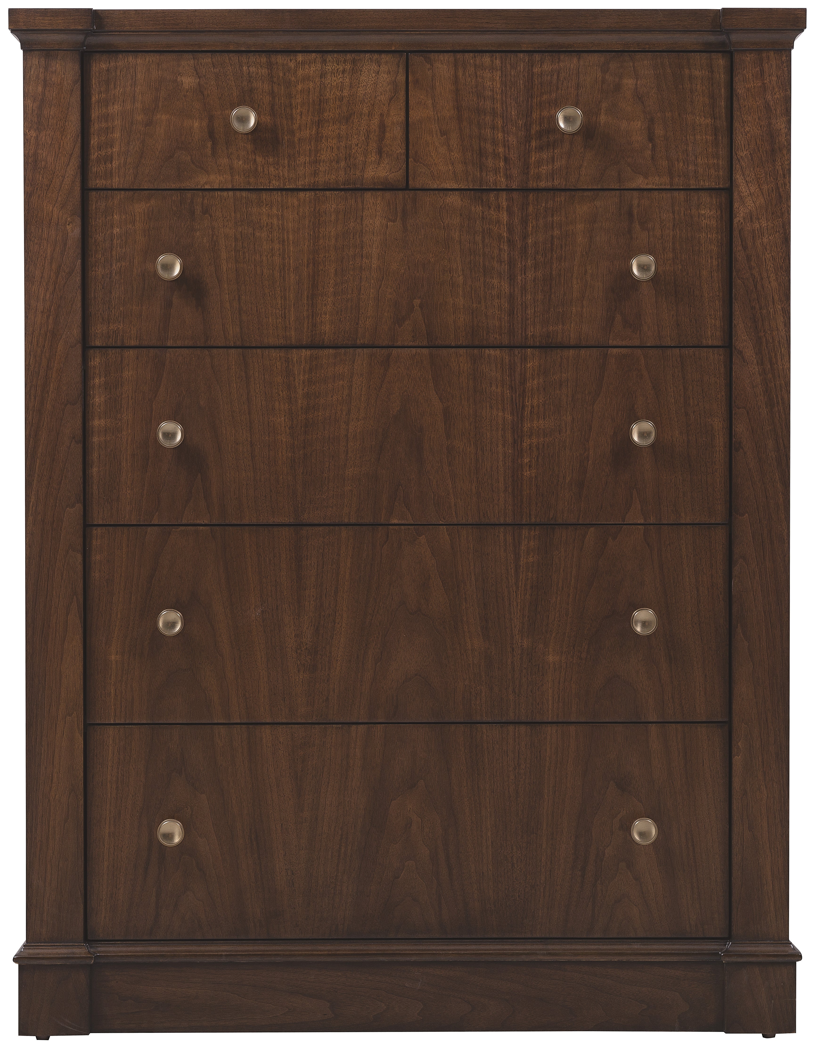 Cedar-lined bottom drawers Finish: The high clarity Classic Walnut finish over figured walnut veneers adds richness and depth. Custom knob hardware in Satin Brass finish. Hooker Furniture utilizes a multiple-step finish process of up to 16 finish steps. This results in an unsurpassed clarity, depth and color richness and durability to our finishes. Through hand-craftsmanship such as rubbing and padding, our finishes feel as good as they look, with a smoothness that is delightful to the touch. Hooker Furniture uses carefully chosen solid wood and select wood veneers over durable wood products in our furniture construction. Use of veneers enables more decorative looks unattainable with solid wood. Veneers are used over durable wood products such as medium density fiberboard (MDF) and particle board, made of renewable resources. MDF and particle board are used in quality furniture for areas that need to be stable, such as large surfaces. These durable wood products do not expand and contract with heat and cold and do not absorb moisture as much as solid wood, which results in stronger and longer-lasting furniture. Figured Walnut Veneer, Oak Veneer, Cedar We recommend dusting frequently with a clean, soft, dry, lint-free cloth. Clean the surface by rubbing in the direction of the grain. We recommend polishing your furniture approximately every six months using a clean, soft, lint-free cloth and rubbing the polish in the direction of the grain. Guardsman furniture polish or any furniture polish that doesn't contain silicone is recommended. Hooker Furniture offers full height, full depth and full width drawers for maximum storage capacity. All drawers have strong, time-tested English or French dovetail construction, for years of problem-free use. Plywood drawer bottoms are attached to plywood drawer sides for strength and durability. Metal side guides or wood on wood guide systems operate smoothly. Dimension (LxWxH):20.00 x 38.50 x 50.00
