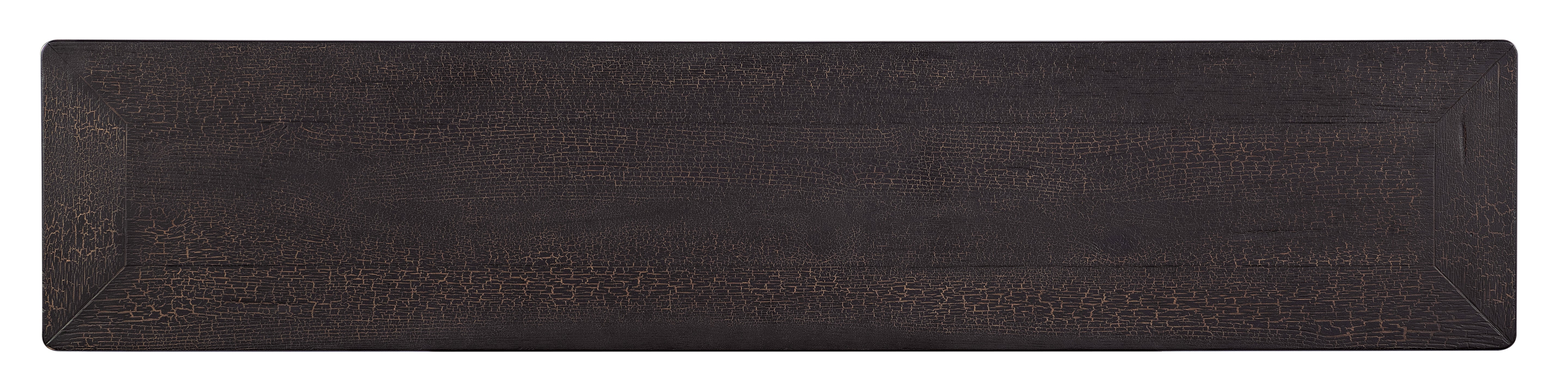 Inspired by the natural beauty, dramatic vistas and rough-hewn timber of the American wilderness, the Big Sky Sofa Table is crafted of Pecky Hickory and Maple Veneers with a Solid Wood edged top. The turned spool legs add a vintage touch. The Charred Timber finish is inspired by the restorative beauty of a forest cleared by a natural fire. The two self-closing drawers have dark brushed bronze metal bar pulls.