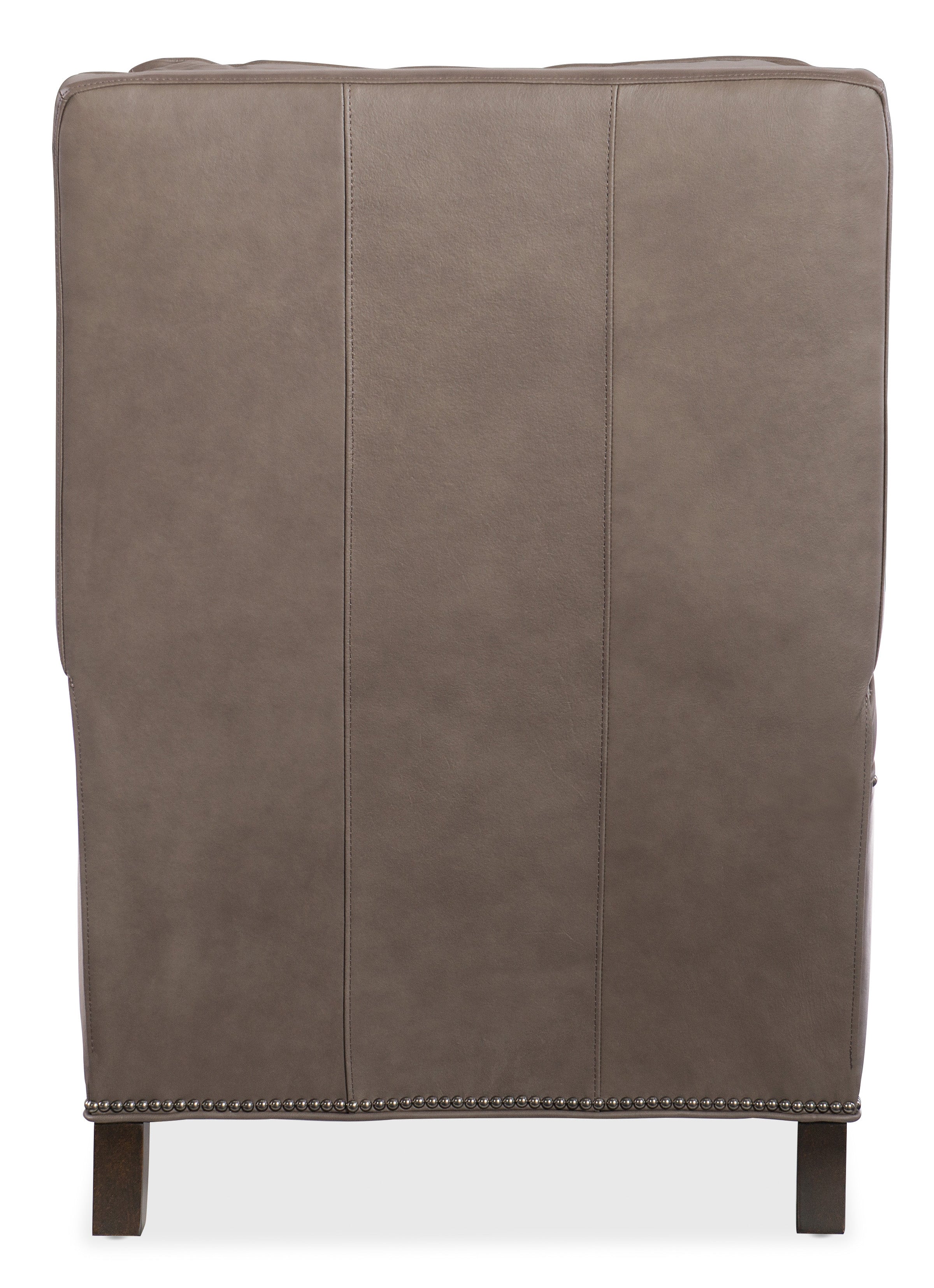 Exquisitely accented by tailored welting on the seat, a modified wing back and nailhead trim on the sides, base and back, the Caleigh Recliner makes comfort look good. The manual recliner pairs the Aspen Lenado finished leather cover in a taupe color with wood legs in the Natchez Brown finish for a warm and welcoming combination.