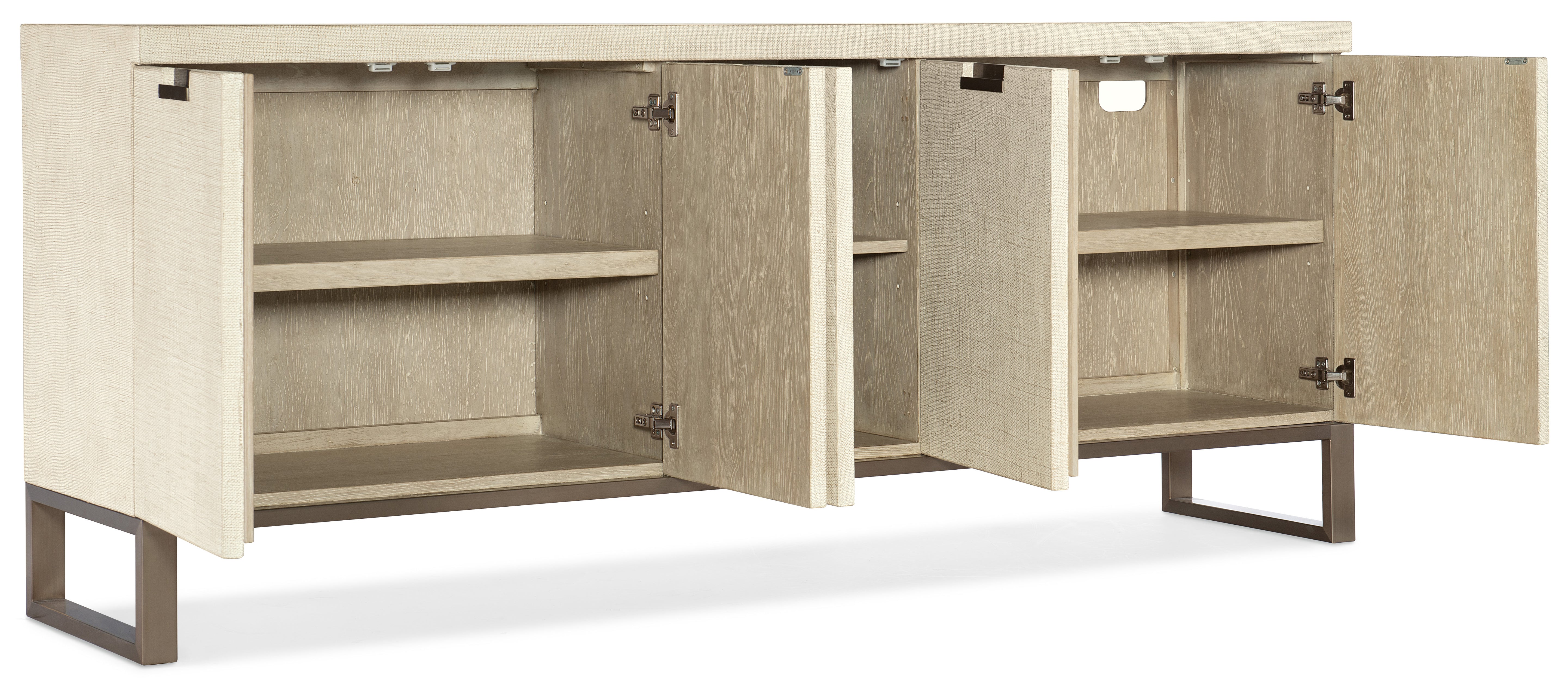 Create a calm and tranquil atmosphere of hospitality with the sleek and sophisticated silhouette of the Cascade Server. Featuring a soothing color palette of whites, cream, taupe and champagne, the 5-door cascade server is brimming with storage. Finished in Pebble Beach, a lacquered burlap finish, the server is accented by a champagne-colored metal base and recessed pulls. There’s one adjustable shelf behind the left and right pair of doors and one adjustable shelf behind the center door.