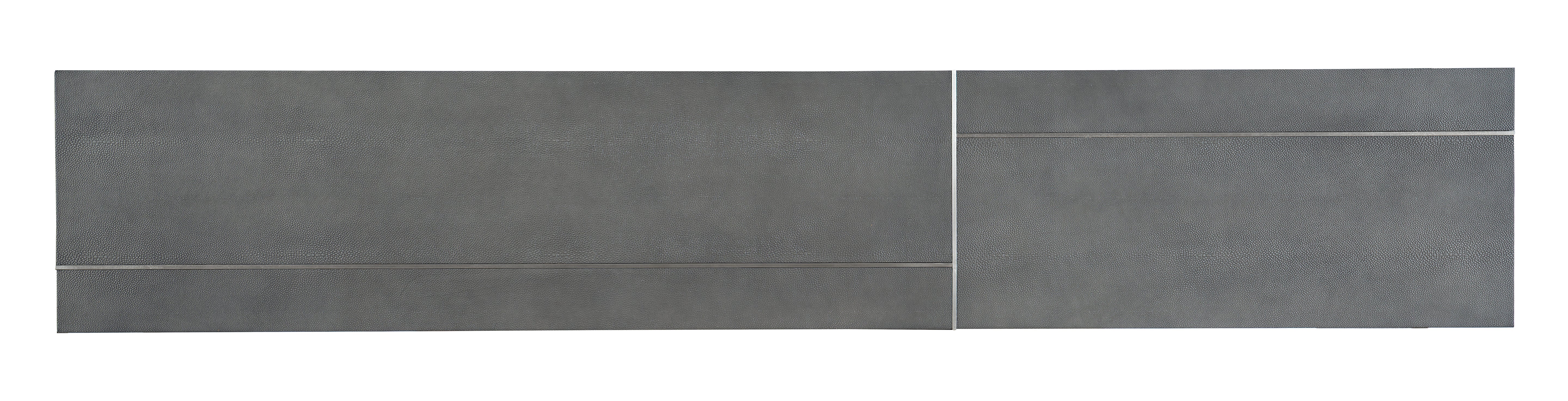 Levelers Finish: Unique hand-hammered forged pewter finished metal with gray faux shagreen top N/A Metal and Faux Shagreen Wipe with a clean, soft, dry, lint-free cloth. Spot clean fabric with damp cloth. Dimension (LxWxH):16.50 x 80.25 x 32.25