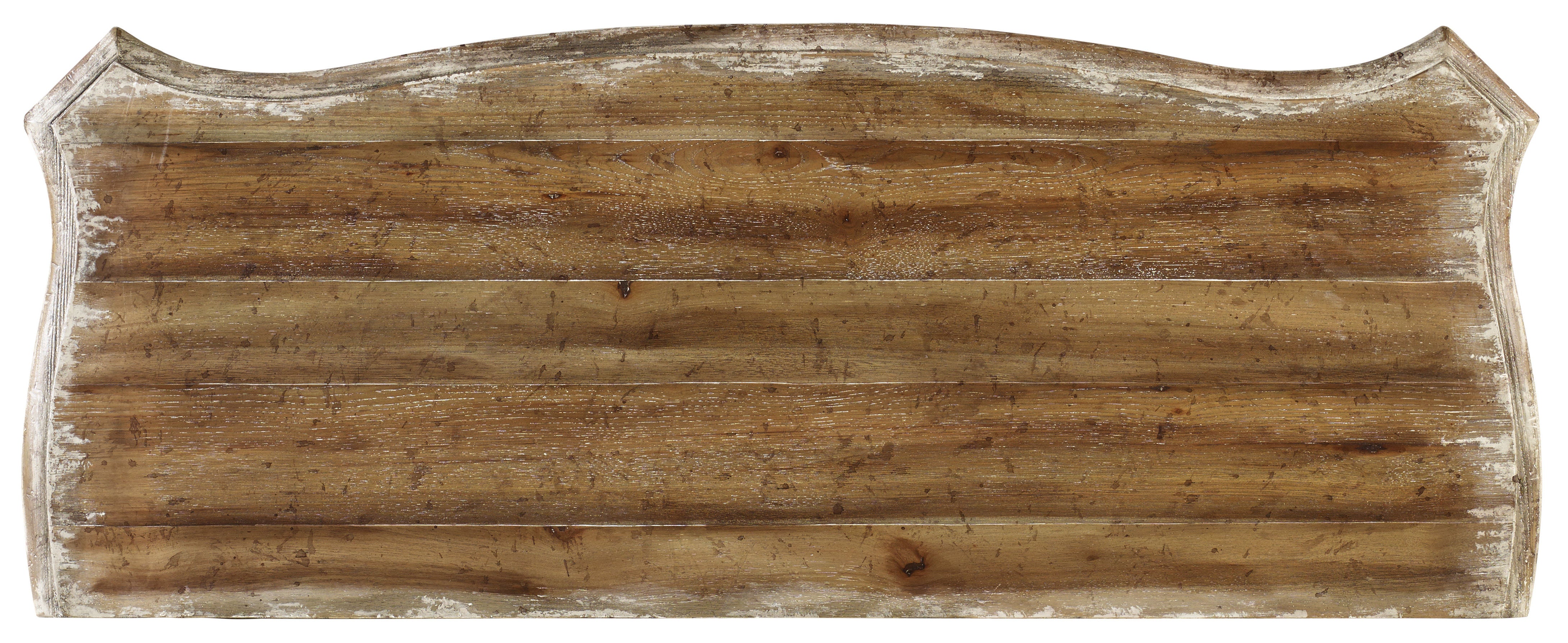 Paris Vintage and Caramel Froth finishes Finish: A combination of Caramel Froth and Paris Vintage. Pecky pecan veneers are warmed by a soft amber color and a touch of aged white paint to highlight distinctive grains and moldings in the Caramel Froth finish. The Paris Vintage finish is a distressed vintage white with fretwork overlay on select pieces. Custom-designed, generously scaled, burnished bronze drawer pulls and hardware is inspired by antiques. Distressing includes scraping lines, sloping lines and rasping. Hooker Furniture utilizes a multiple-step finish process of up to 16 finish steps. This results in an unsurpassed clarity, depth and color richness and durability to our finishes. Through hand-craftsmanship such as rubbing and padding, our finishes feel as good as they look, with a smoothness that is delightful to the touch. Hooker Furniture uses carefully chosen solid wood and select wood veneers over durable wood products in our furniture construction. Use of veneers enables more decorative looks unattainable with solid wood. Veneers are used over durable wood products such as medium density fiberboard (MDF) and particle board, made of renewable resources. MDF and particle board are used in quality furniture for areas that need to be stable, such as large surfaces. These durable wood products do not expand and contract with heat and cold and do not absorb moisture as much as solid wood, which results in stronger and longer-lasting furniture. Pecan Veneers, Resin, Antique Mirror and Solid-Wood Edge Top We recommend dusting frequently with a clean, soft, dry, lint-free cloth. Clean the surface by rubbing in the direction of the grain. We recommend polishing your furniture approximately every six months using a clean, soft, lint-free cloth and rubbing the polish in the direction of the grain. Guardsman furniture polish or any furniture polish that doesn't contain silicone is recommended. Dimension (LxWxH):23.00 x 59.00 x 34.00