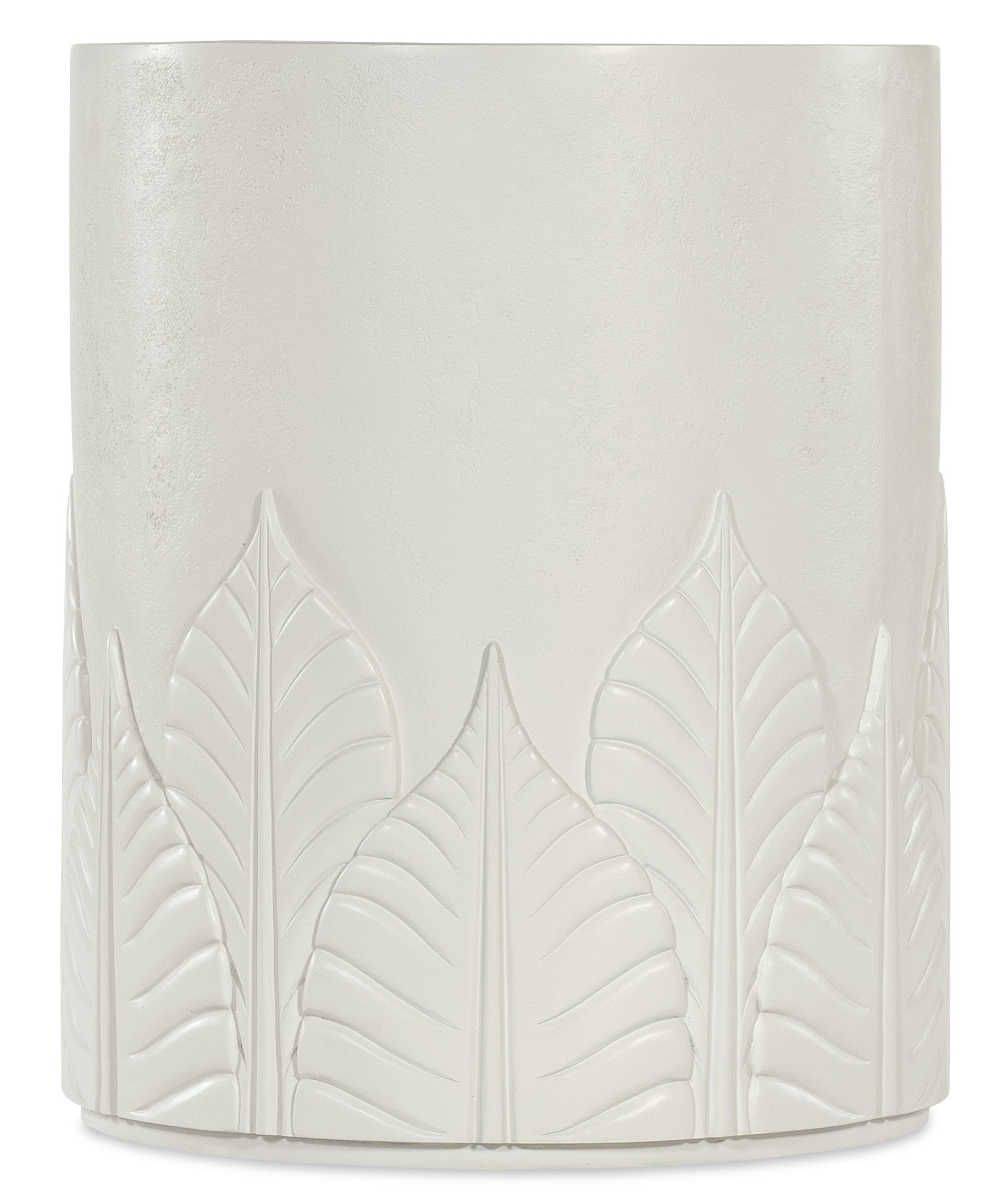 The Amelia Round End Table mirrors the design of the cocktail table with its textured plaster-like finish and embossed leaf motif. Crafted from wood and resin, it features a round shape and durable construction. Its clean, white tones make it a perfect addition to any contemporary or casual space, providing function and style in a smaller footprint.