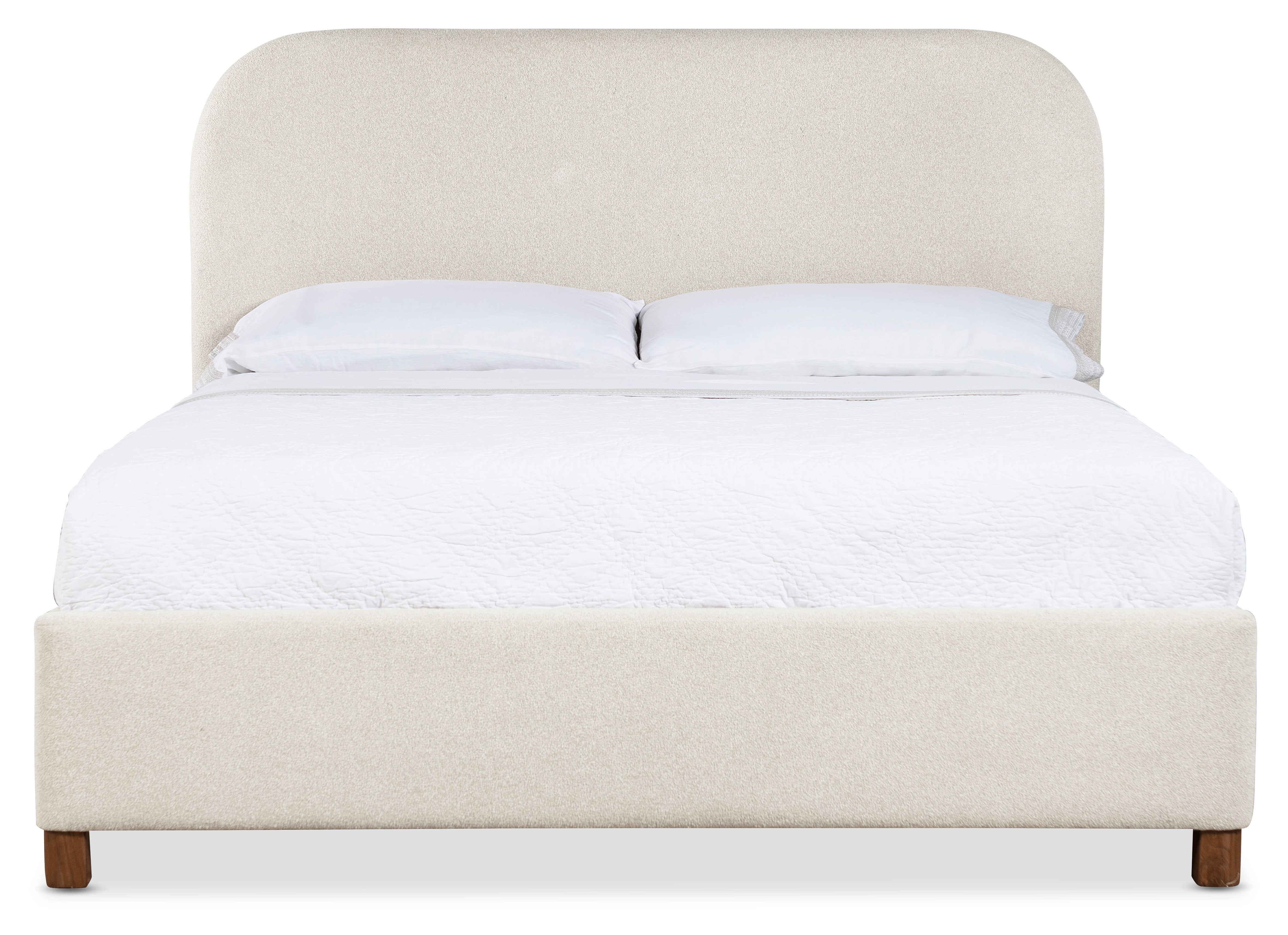 Tailored in creamy beige fabric, this king bed balances softness and structure with its clean lines and wood block feet.