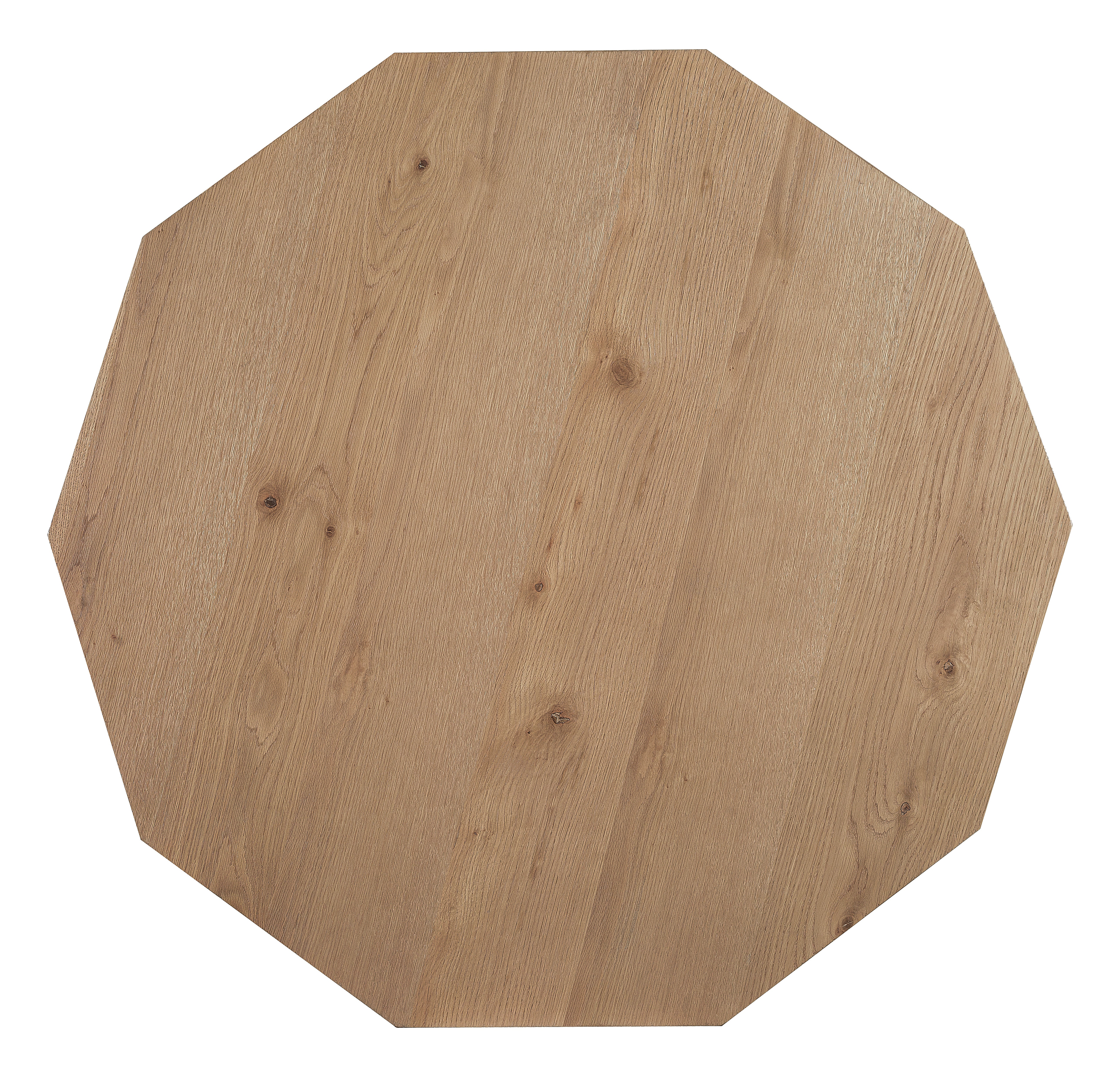 The Haven Cocktail Table is a standout piece with a 10-sided, decagon shape and faceted "window pane" design. The medium natural oak finish paired with marble accents on the inset panels creates a sophisticated look, while the plinth base adds stability. Ideal for adding a touch of elegance to a living room, this cocktail table embodies modern luxury with its unique design and fine materials.