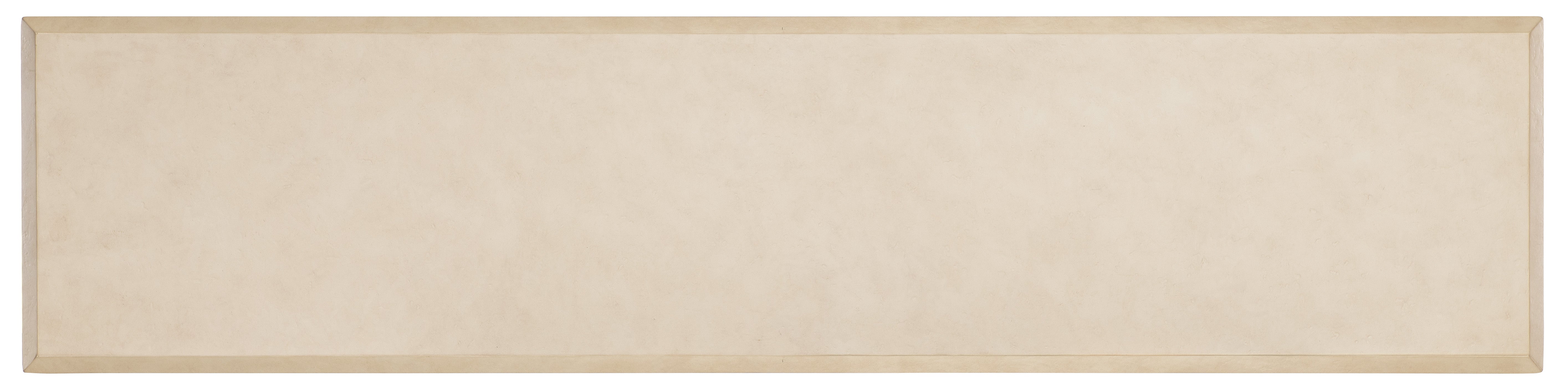 Tiered, ridge architectural design Finish: Textured Alabaster plaster white finish Hooker Furniture utilizes a multiple-step finish process of up to 16 finish steps. This results in an unsurpassed clarity, depth and color richness and durability to our finishes. Through hand-craftsmanship such as rubbing and padding, our finishes feel as good as they look, with a smoothness that is delightful to the touch. Hooker Furniture uses carefully chosen solid wood and select wood veneers over durable wood products in our furniture construction. Use of veneers enables more decorative looks unattainable with solid wood. Veneers are used over durable wood products such as medium density fiberboard (MDF) and particle board, made of renewable resources. MDF and particle board are used in quality furniture for areas that need to be stable, such as large surfaces. These durable wood products do not expand and contract with heat and cold and do not absorb moisture as much as solid wood, which results in stronger and longer-lasting furniture. Wood and Resin We recommend dusting frequently with a clean, soft, dry, lint-free cloth. Clean the surface by rubbing in the direction of the grain. We recommend polishing your furniture approximately every six months using a clean, soft, lint-free cloth and rubbing the polish in the direction of the grain. Guardsman furniture polish or any furniture polish that doesn't contain silicone is recommended. Dimension (LxWxH):16.00 x 68.00 x 33.00
