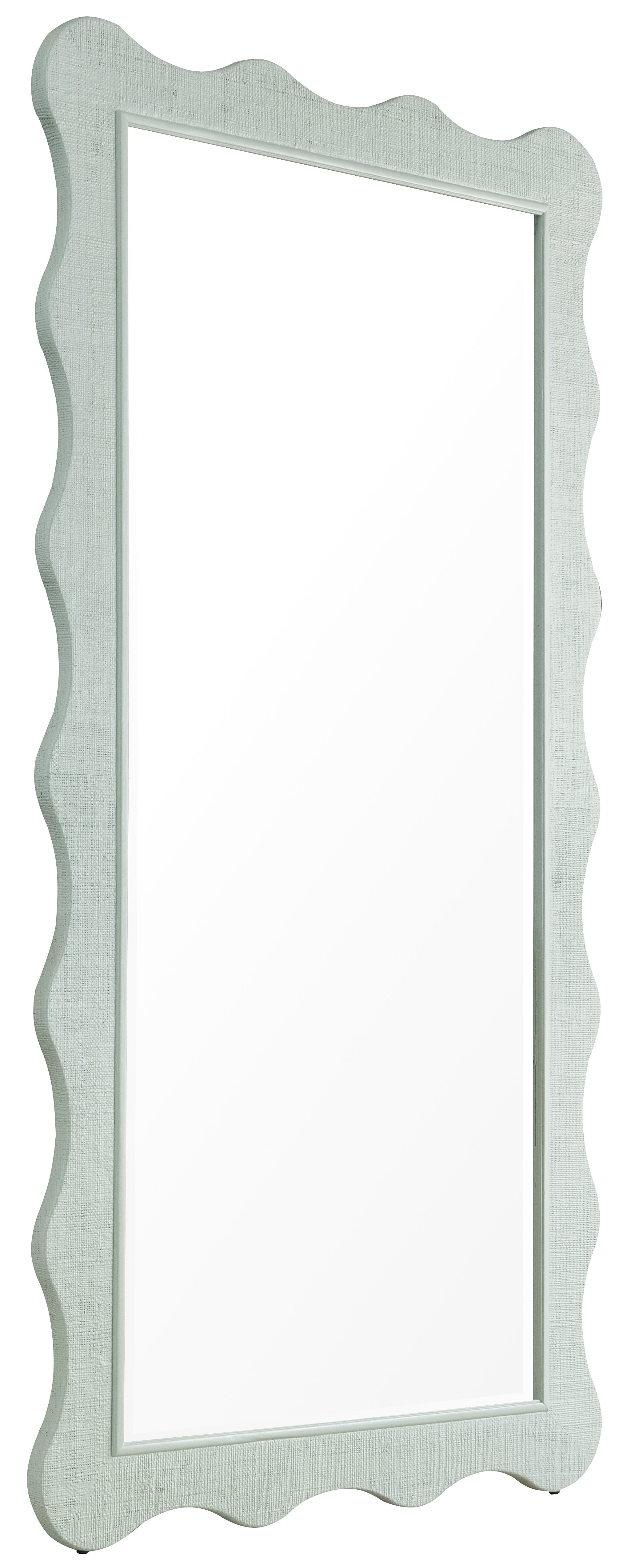 Elevate your entryway or bedroom with the Waverly Leaner Mirror, featuring a scalloped silhouette, beveled glass, and a unique blue-green painted raffia frame. A bold blend of texture and color for modern eclectic spaces.