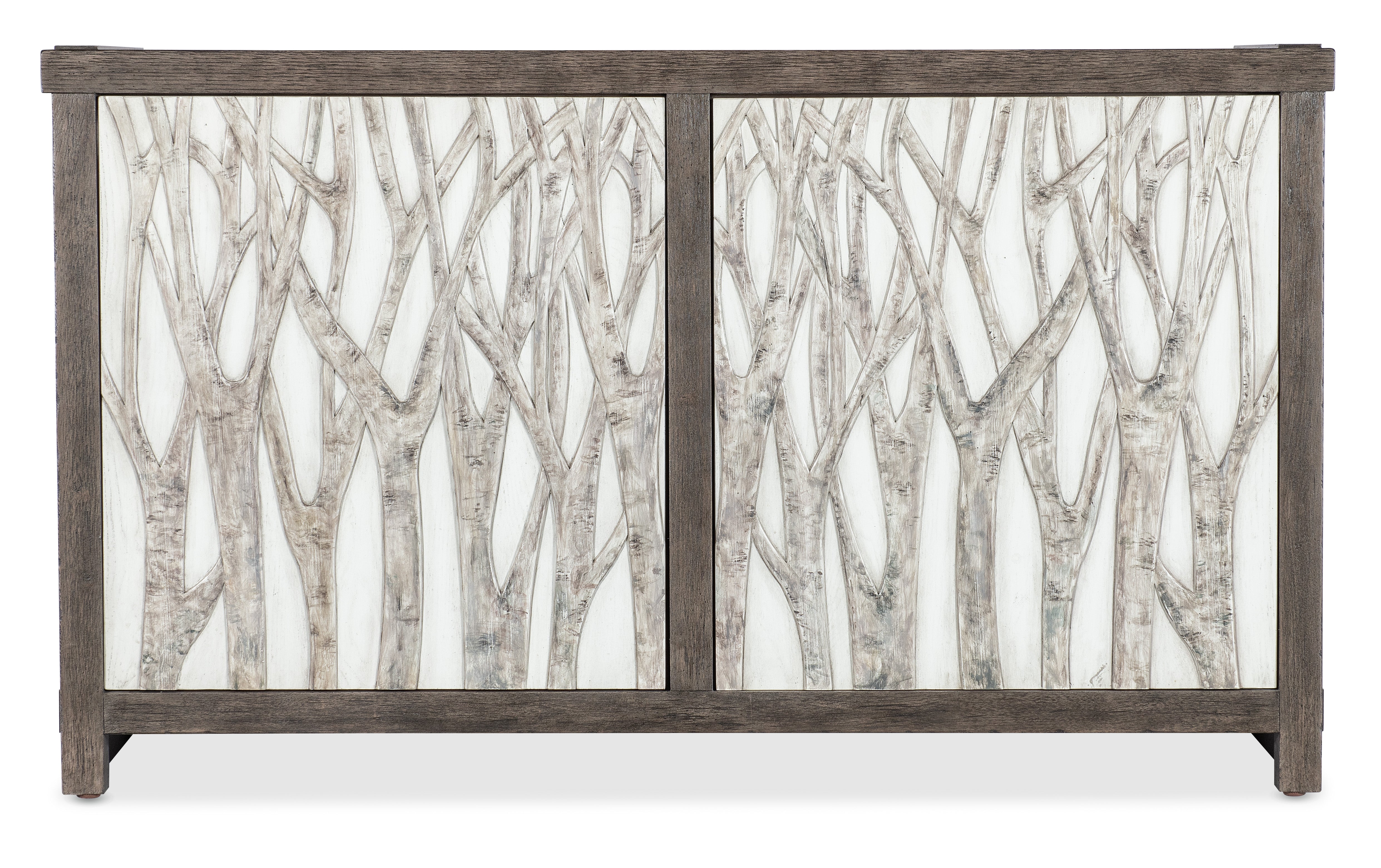 Raised tree and branch motif on contrasting white background on door fronts Finish: Dark wood finish with raised tree and branch motif on contrasting white background on door fronts Hooker Furniture utilizes a multiple-step finish process of up to 16 finish steps. This results in an unsurpassed clarity, depth and color richness and durability to our finishes. Through hand-craftsmanship such as rubbing and padding, our finishes feel as good as they look, with a smoothness that is delightful to the touch. Hooker Furniture uses carefully chosen solid wood and select wood veneers over durable wood products in our furniture construction. Use of veneers enables more decorative looks unattainable with solid wood. Veneers are used over durable wood products such as medium density fiberboard (MDF) and particle board, made of renewable resources. MDF and particle board are used in quality furniture for areas that need to be stable, such as large surfaces. These durable wood products do not expand and contract with heat and cold and do not absorb moisture as much as solid wood, which results in stronger and longer-lasting furniture. Oak Veneers and Resin We recommend dusting frequently with a clean, soft, dry, lint-free cloth. Clean the surface by rubbing in the direction of the grain. We recommend polishing your furniture approximately every six months using a clean, soft, lint-free cloth and rubbing the polish in the direction of the grain. Guardsman furniture polish or any furniture polish that doesn't contain silicone is recommended. Dimension (LxWxH):19.00 x 60.00 x 35.00
