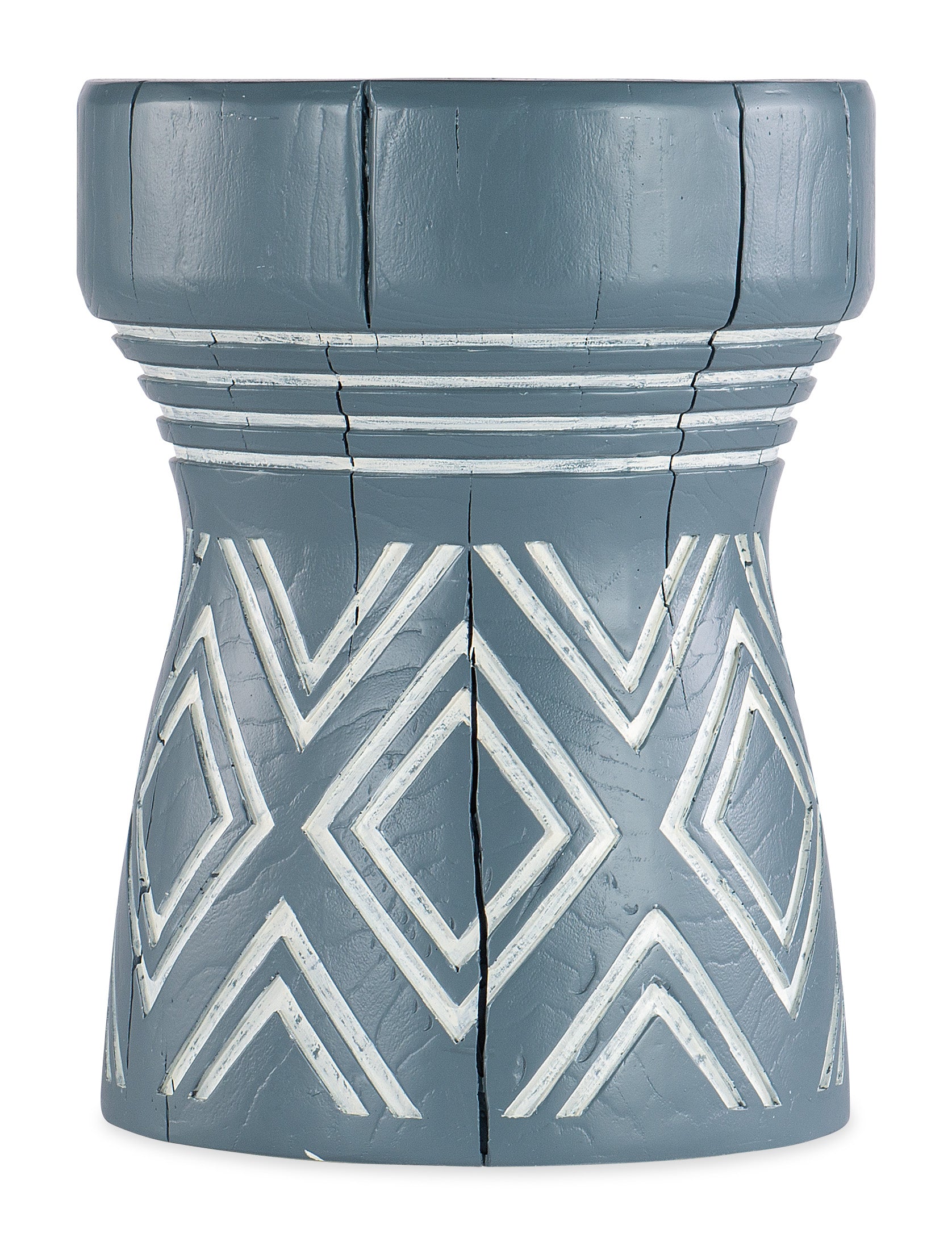 Crafted with cast resin in a design to portray nature’s aged roots, the Carved Stump Side Table is hand-painted with a bold geometric tribal print in white on a soft blue background.