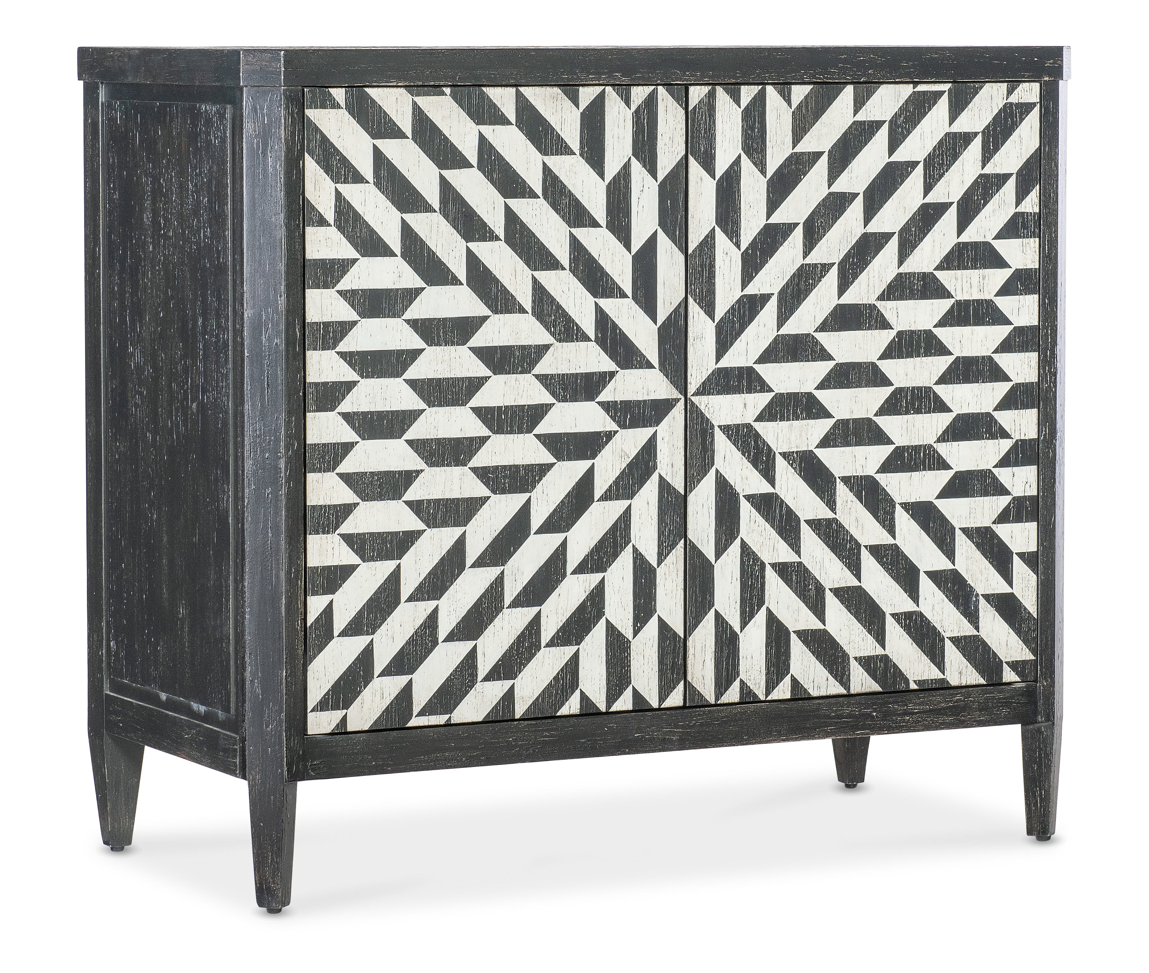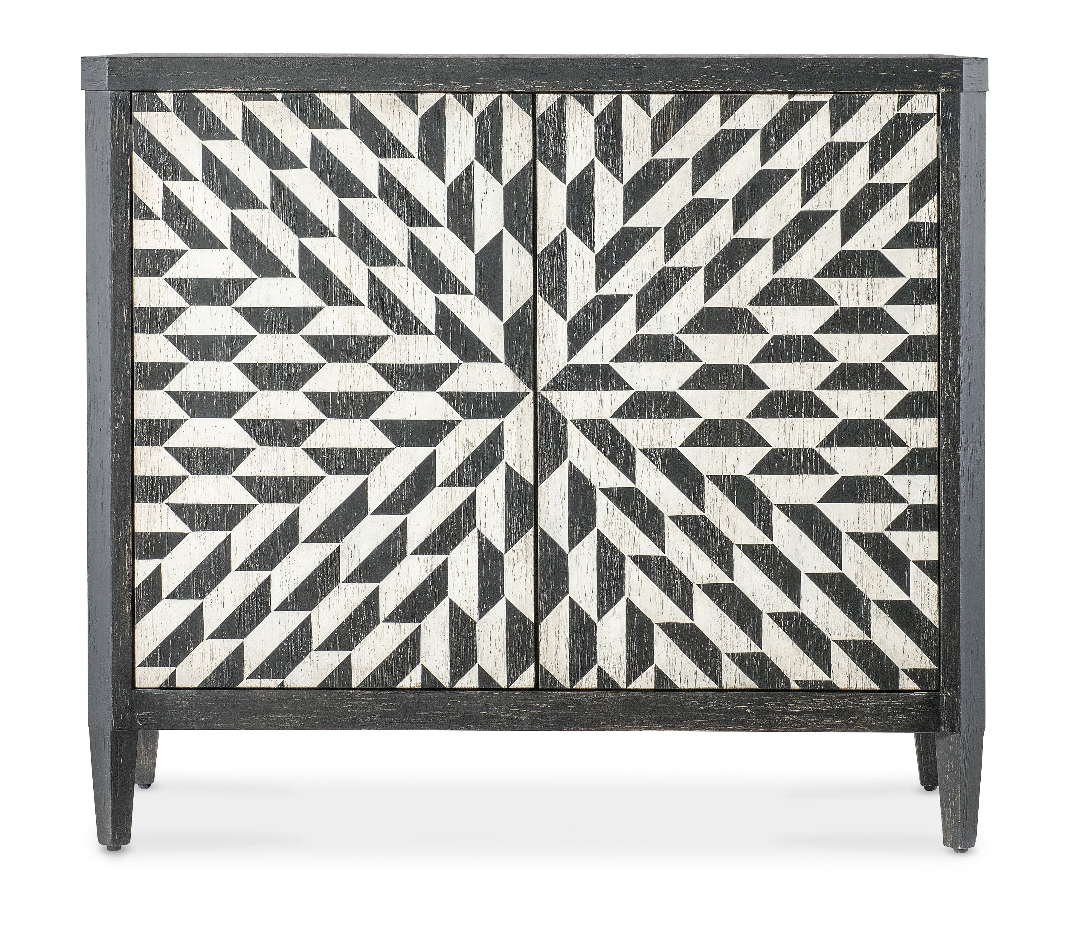 The Lancaster Hall Chest offers the classic and always-stylish black & white combination and timeless painted starburst pattern on the door fronts. Crafted of Maple Veneers, the two doors have soft-close hinges and magnetic door catches with one adjustable shelf behind the doors.
