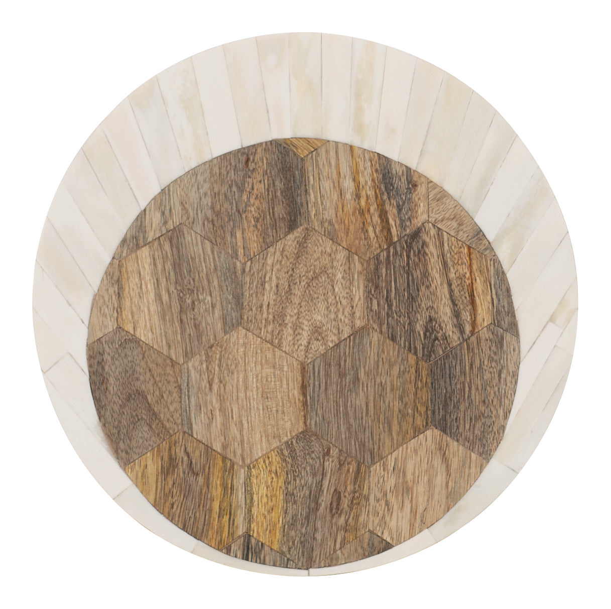Round shape Finish: Bronze metal base with natural bone inlay top Hooker Furniture uses carefully chosen solid wood and select wood veneers over durable wood products in our furniture construction. Use of veneers enables more decorative looks unattainable with solid wood. Veneers are used over durable wood products such as medium density fiberboard (MDF) and particle board, made of renewable resources. MDF and particle board are used in quality furniture for areas that need to be stable, such as large surfaces. These durable wood products do not expand and contract with heat and cold and do not absorb moisture as much as solid wood, which results in stronger and longer-lasting furniture. Bone Inlay and Iron Wipe with a clean, soft, dry, lint-free cloth. Spot clean fabric with damp cloth. Dimension (LxWxH):11.00 x 11.00 x 24.00