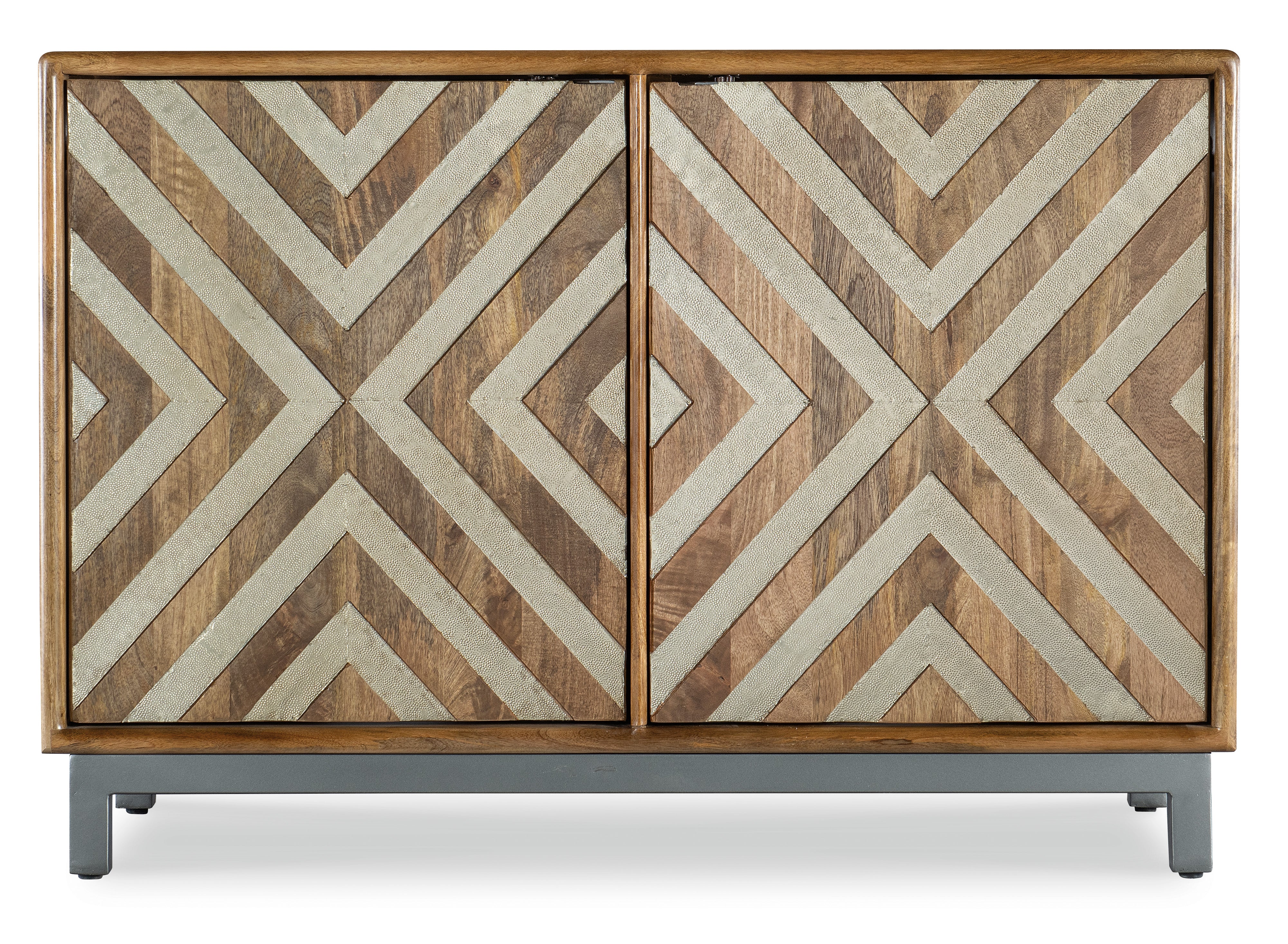 Timeless yet casual and relaxed, the Serramonte Two-Door Chest combines Mango Solid Wood with a Silver Clad chevron design on the door fronts and a brushed pewter iron base. The two doors have roller catches and there is one removable shelf behind each door. The interior matches the outside of the case. The ventilated back panel with wire management makes the chest media-friendly.