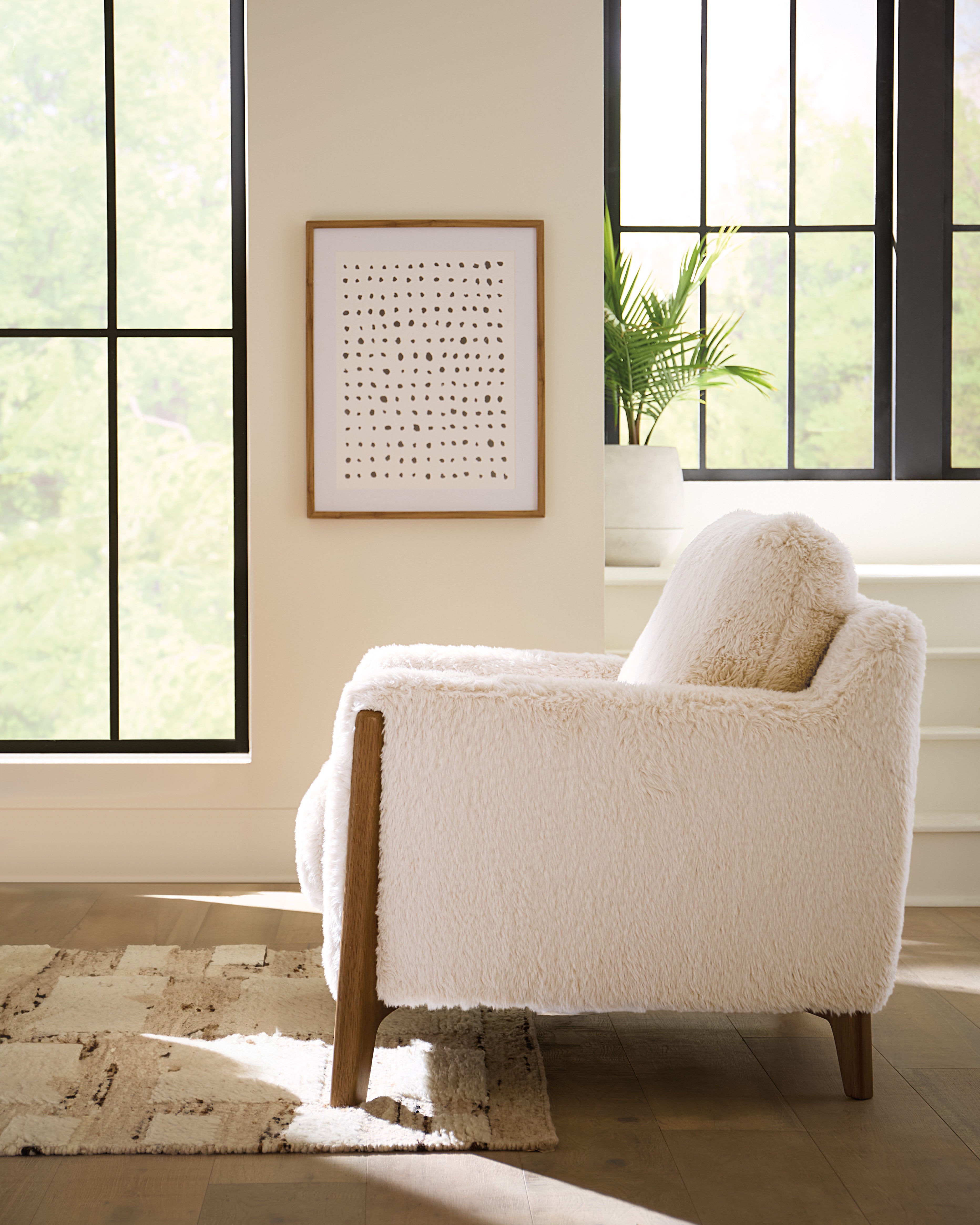 Get the laid-back feeling of staying in your bath robe all day with the Cynthia Chair, covered all over in a cozy furry fabric called Yakety Yak Sand. The wood legs and wood trim on the arm fronts have a light natural finish.