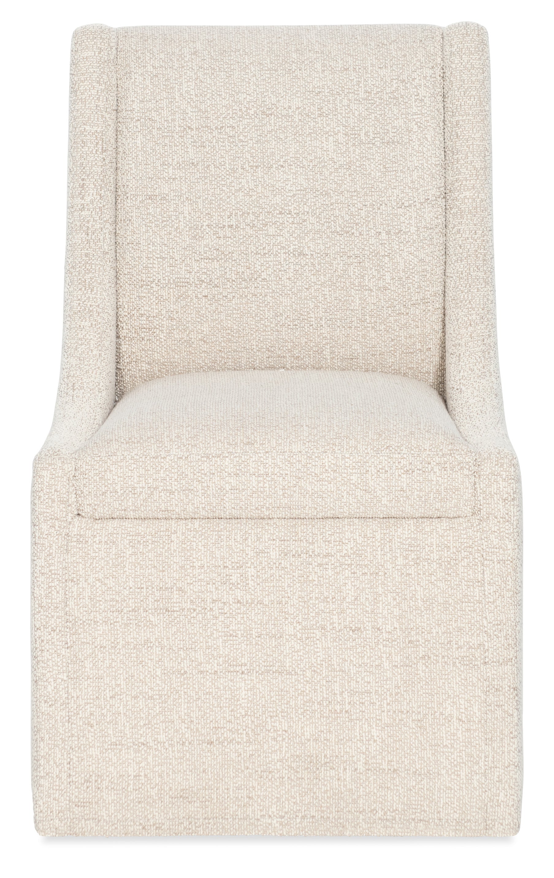 The Eleana Castered Side Chair delivers flexible seating with its low sloped track arms, beige fabric upholstery, and smooth casters for effortless movement. With its fully upholstered design, this chair combines casual elegance with functionality, making it ideal for transitional dining spaces.
