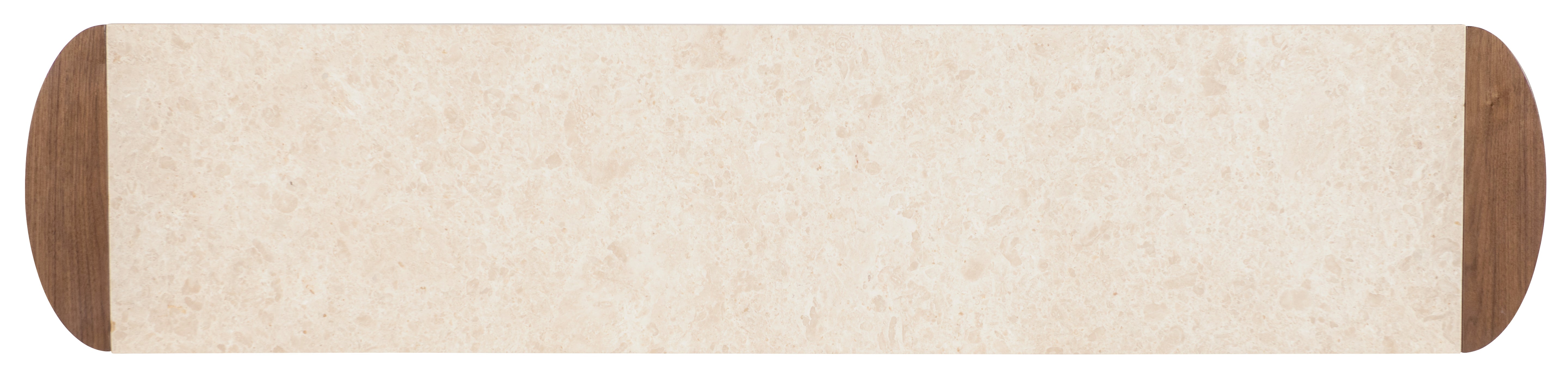 Sleek and versatile, the Eleana Console Table pairs Light Caramel walnut veneers with a plated Sunlit Bronze metal base in a bent-metal design. The softly rounded rectangular top and one fixed wood shelf offer both style and storage, making this table an ideal accent for transitional spaces.