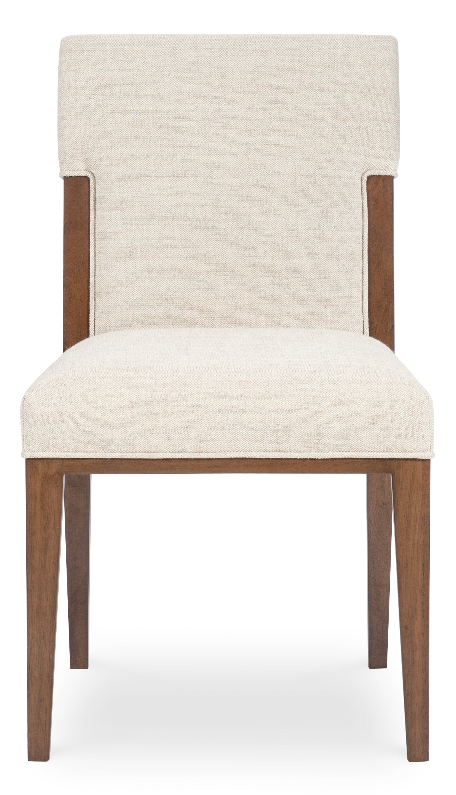 The Eleana Dining Chair showcases a harmonious mix of Light Caramel walnut veneer and beige fabric upholstery, complete with welt trim and tapered wooden legs. Designed for both style and comfort, its understated elegance complements a wide range of dining tables, making it the ideal choice for modern, transitional interiors.