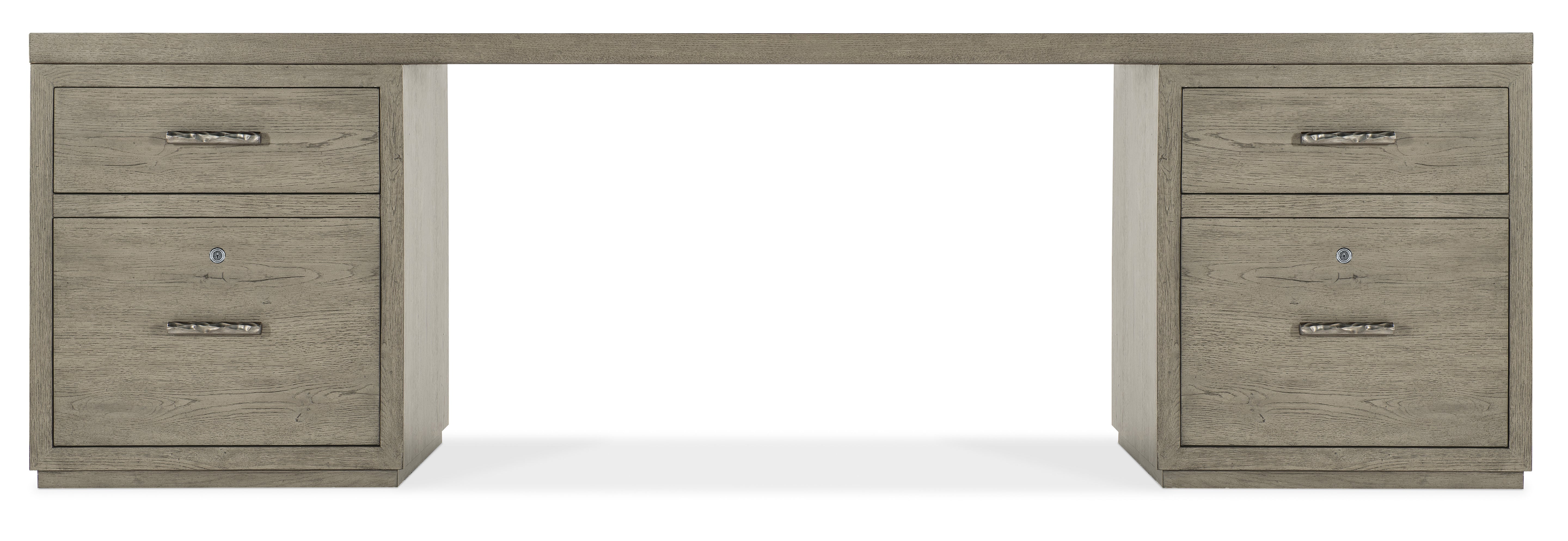 Capturing the essence of nature’s organic color palette on a clean-lined, simple silhouette, the Linville Falls Desk is crafted of Oak Veneers with a soft smoked gray Mink finish. The expansive 96-inch wide top is flanked on each end with two small files. Each file has a top utility drawer and a lower locking file drawer with pendaflex filing system. The desk is fully finished on the back so it can be floated in a room.