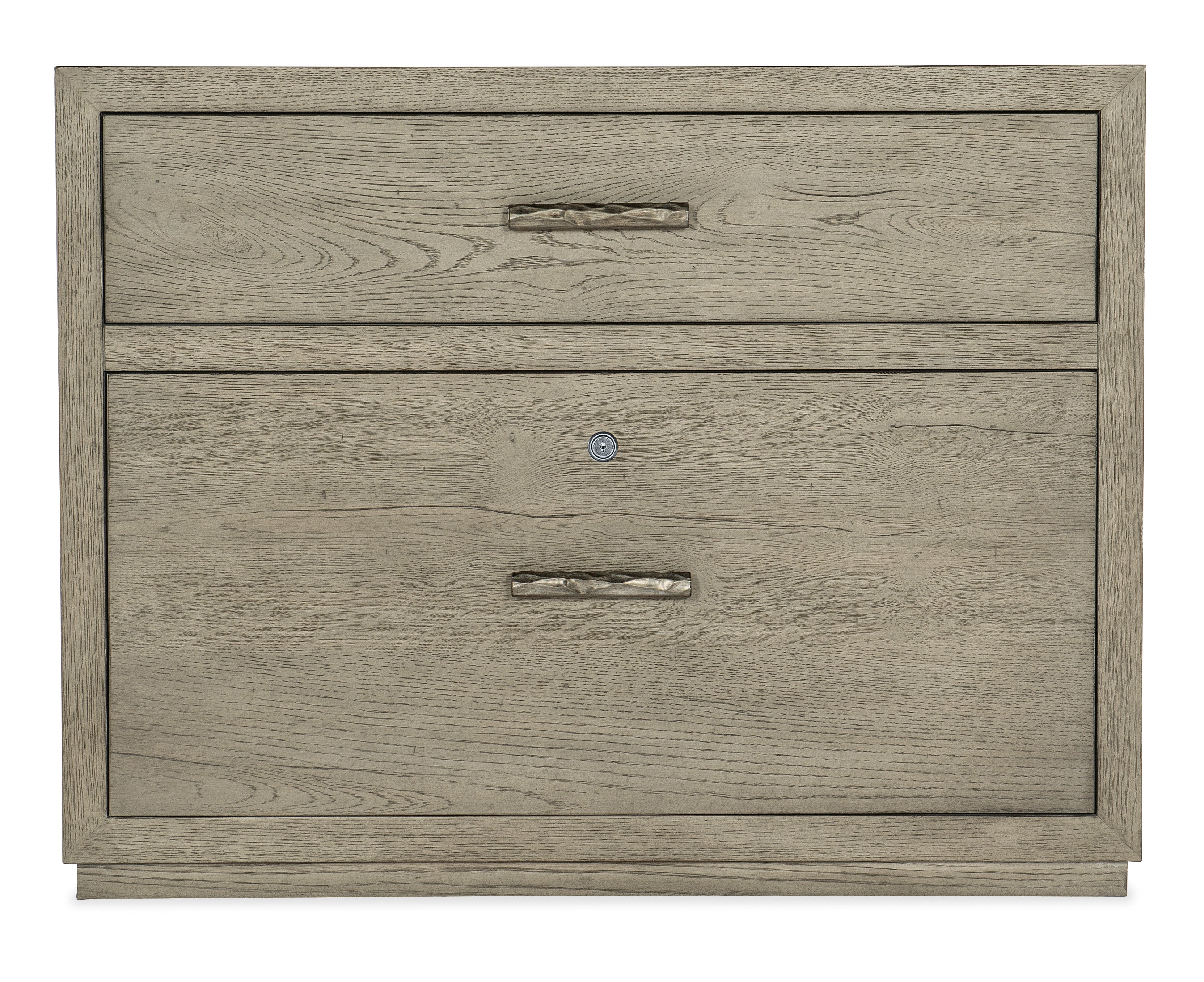 The Linville Falls Lateral File pairs the rustic weathered smoked gray Mink finish with an organic grain pattern and clean modern lines. Crafted of Oak Veneers, the lateral file is accented with textured metal bar pulls in an antique pewter finish and features a top utility drawer and a lower locking file drawer with pendaflex filing system. Finished on the back so it can be floated in a room, it can be used alone or with coordinating modular pieces including desks, corner desks, and an etagere.