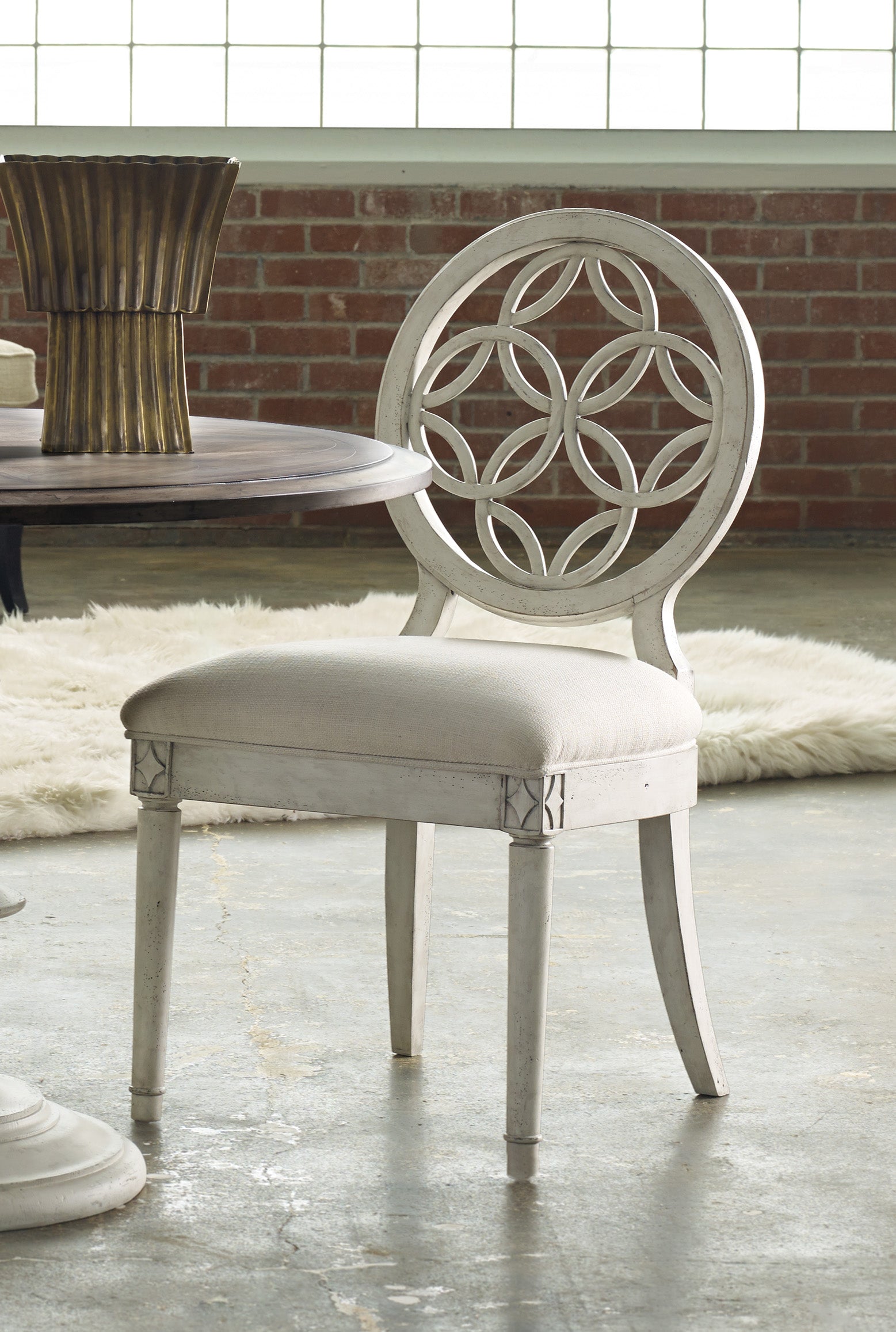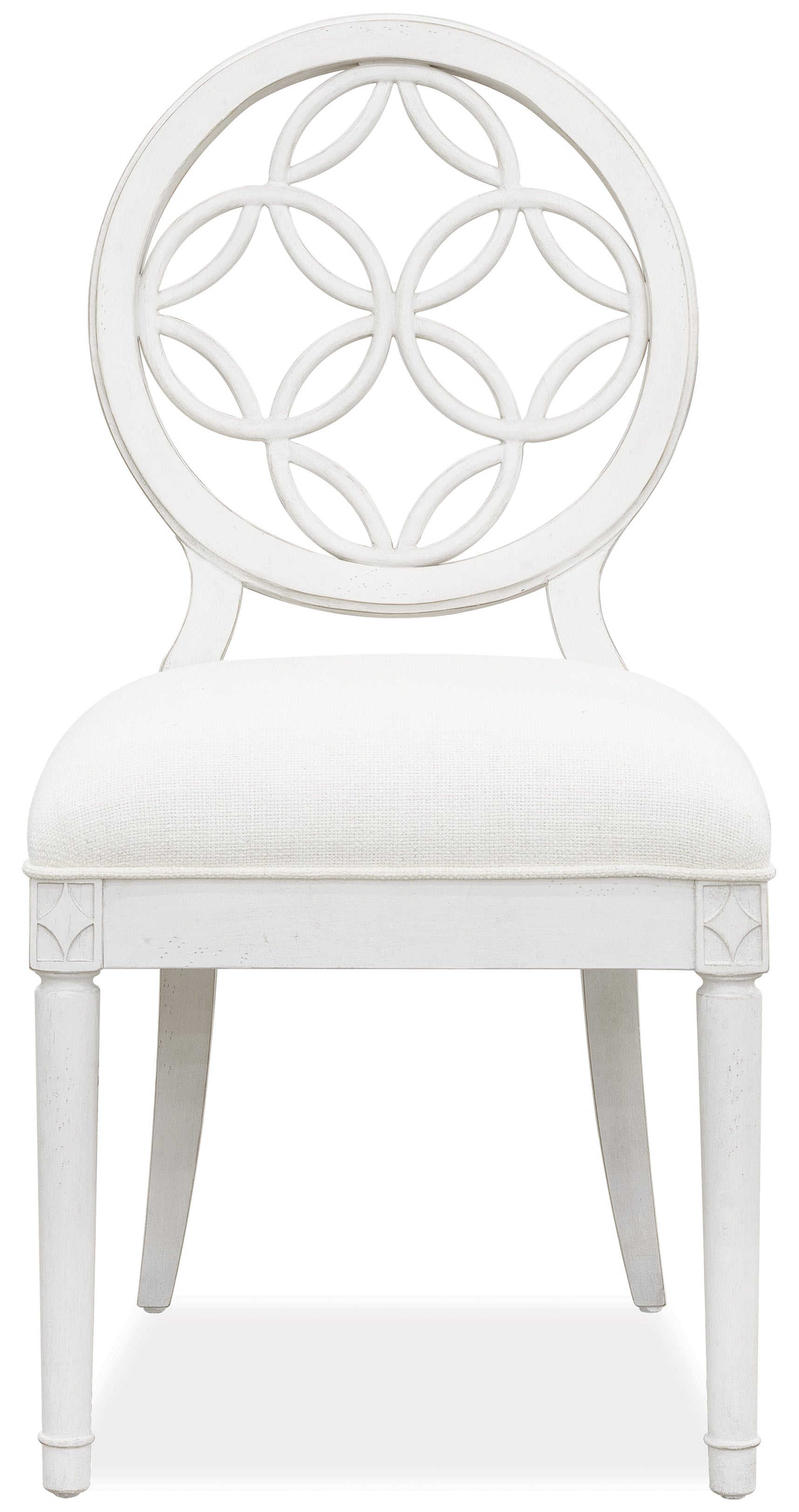 With a lace-like interlocking circle fretwork back, the Brynlee Side Chair is pretty and poised to offer comfort for gathering times with family and friends. The creamy white finish has light distressing for a laid-back luxury, and is complemented by the winter white-colored Lindy Snow linen-polyester blend fabric.