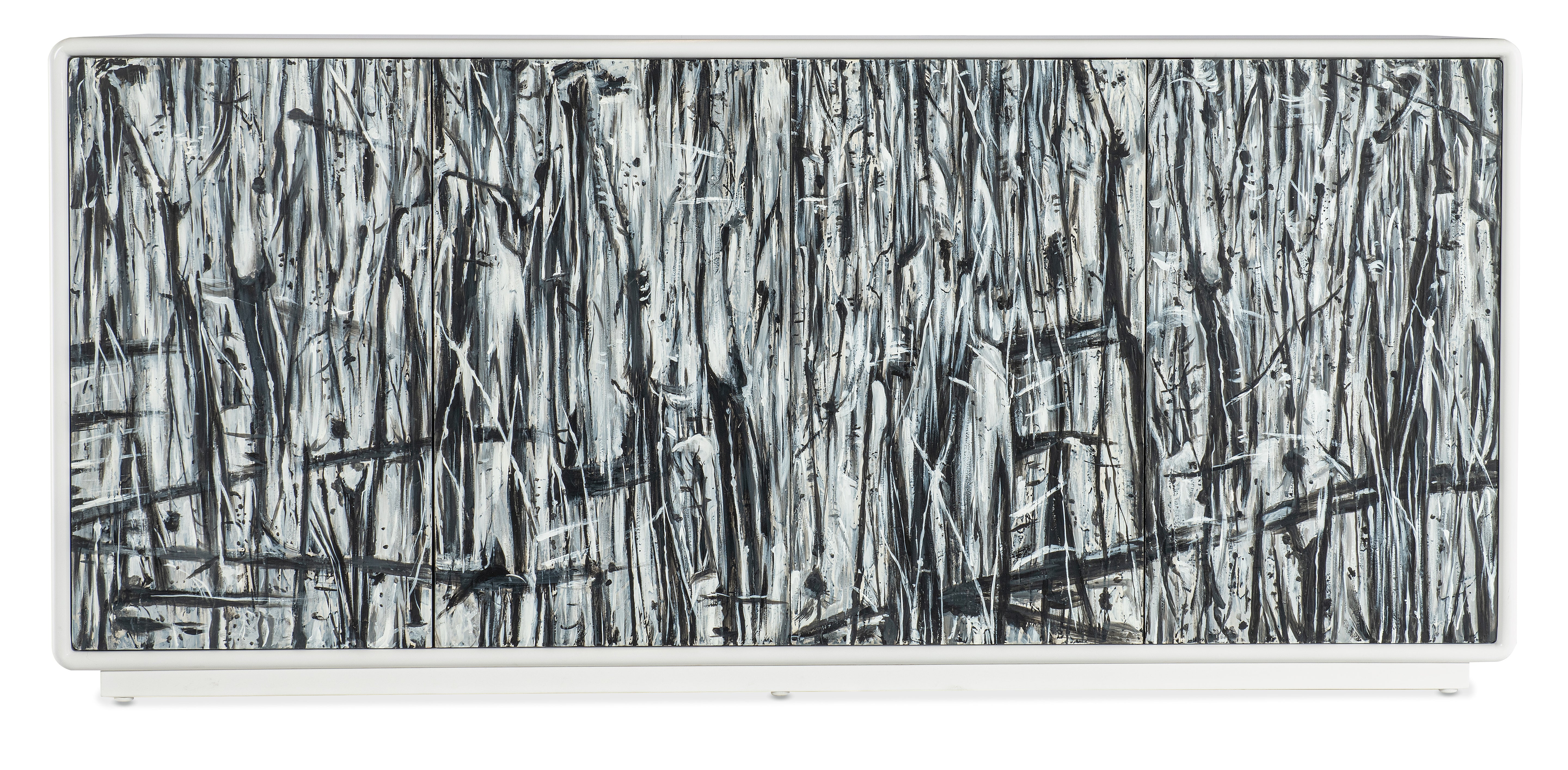 Abstract and elemental yet elegant, the Graffitio Credenza is an intriguing and artsy piece with bonus function. The door fronts in a white, gray and black hand-painted design open to reveal two adjustable shelves behind each pair of doors and wire management holes. Crafted of Maple Veneers, the credenza has a plinth base, and the doors open effortlessly with touch latches.