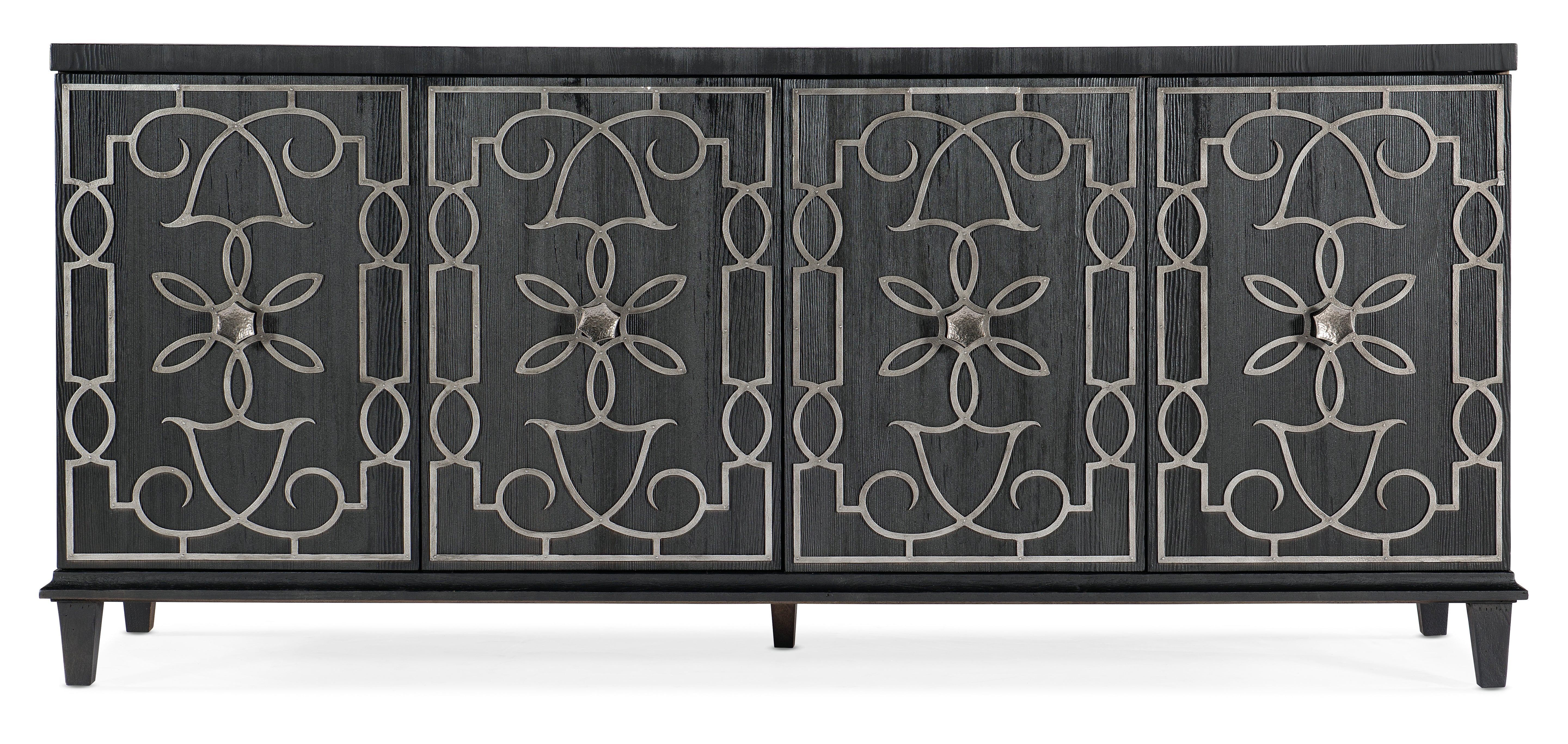 With a Moroccan flair and an elegant black and silver color scheme, the Madeline Credenza is crafted of Pine Veneers with a black wood finish, textured metal hexagonal knobs and silver floral motif accents. With four doors, there are two drawers behind each pair of center doors, two adjustable shelves behind each outside door and one fixed shelf above the drawer in the center section. Ventilated back panel with hand holes.