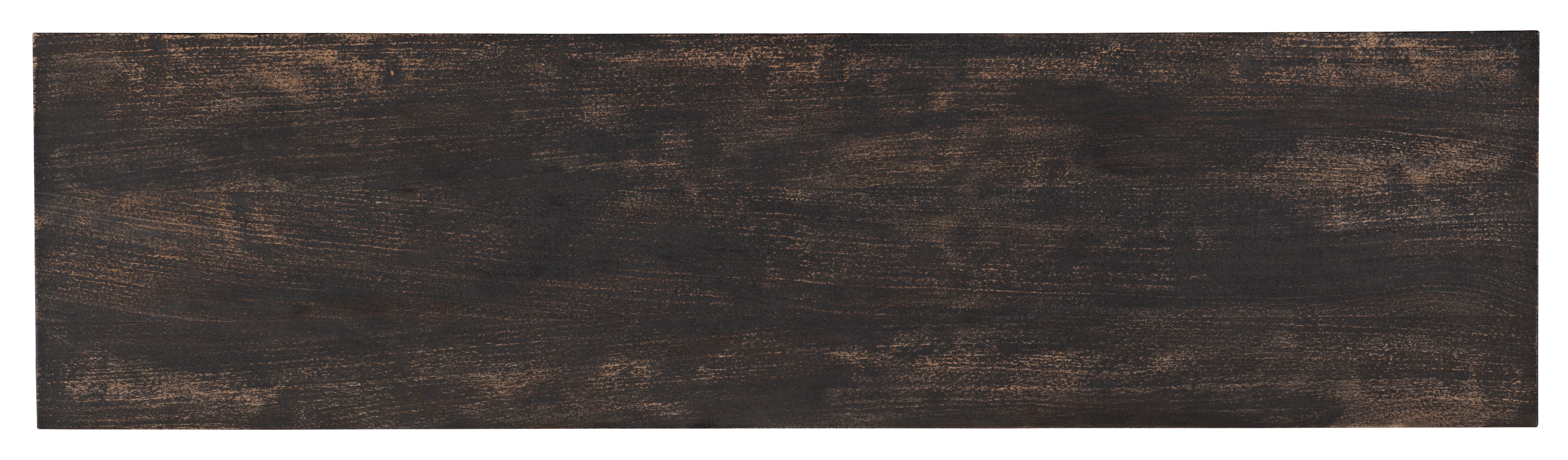 Levelers Finish: Black finish with rub-through. Honeycomb pattern metal overlay is antique bronze with antique bronze starburst. Large rectangular hardware in metal and agate. Distressing includes sandblasting and wire brushing. Hooker Furniture utilizes a multiple-step finish process of up to 16 finish steps. This results in an unsurpassed clarity, depth and color richness and durability to our finishes. Through hand-craftsmanship such as rubbing and padding, our finishes feel as good as they look, with a smoothness that is delightful to the touch. Hooker Furniture uses carefully chosen solid wood and select wood veneers over durable wood products in our furniture construction. Use of veneers enables more decorative looks unattainable with solid wood. Veneers are used over durable wood products such as medium density fiberboard (MDF) and particle board, made of renewable resources. MDF and particle board are used in quality furniture for areas that need to be stable, such as large surfaces. These durable wood products do not expand and contract with heat and cold and do not absorb moisture as much as solid wood, which results in stronger and longer-lasting furniture. Mango Wood with Brass Sheet, Agate and Brass We recommend dusting frequently with a clean, soft, dry, lint-free cloth. Clean the surface by rubbing in the direction of the grain. We recommend polishing your furniture approximately every six months using a clean, soft, lint-free cloth and rubbing the polish in the direction of the grain. Guardsman furniture polish or any furniture polish that doesn't contain silicone is recommended. Dimension (LxWxH):22.00 x 84.00 x 36.50