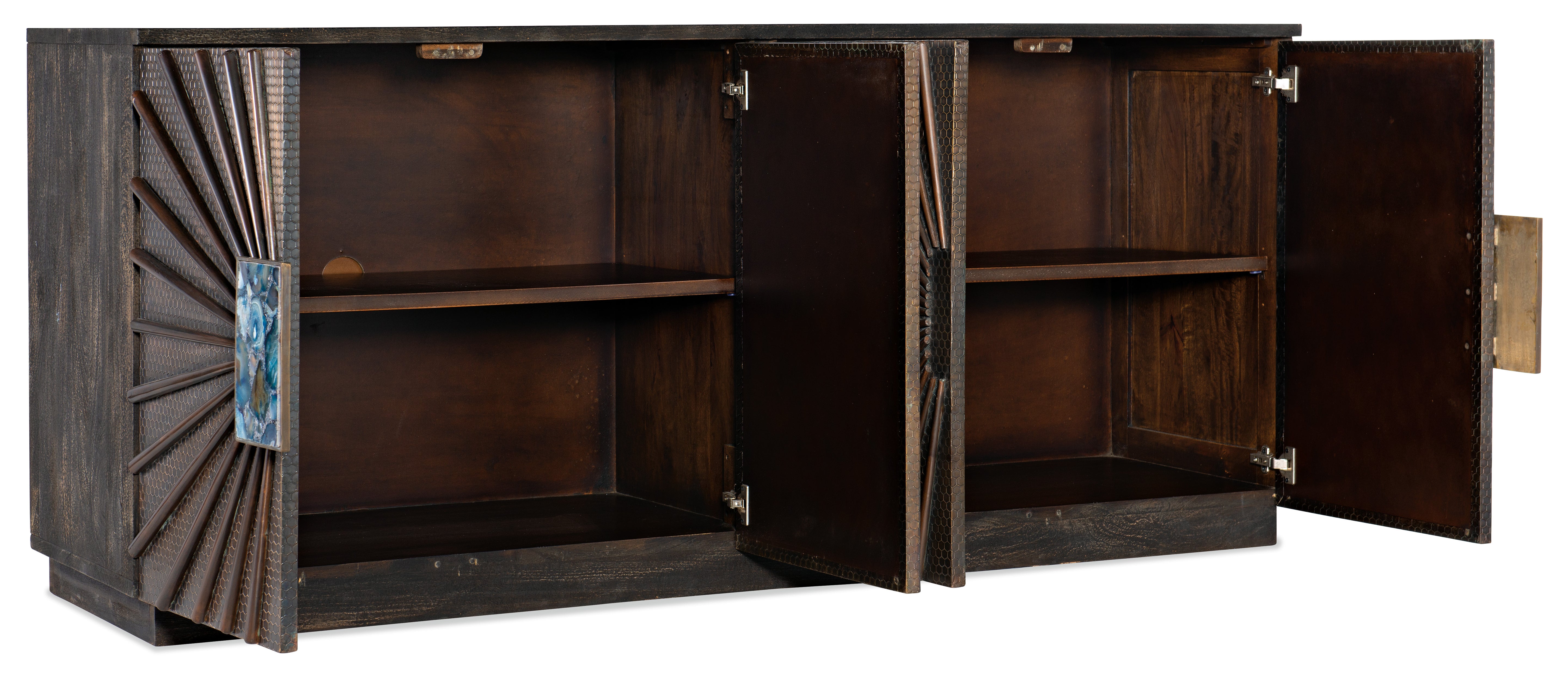 A bold and artistic marriage of Mango Wood, brass and agate stone, the Tara Credenza has a honeycomb-pattern metal overlay and an antique bronze colored starburst on the doors. The case is finished in a black with rub-through, and the dramatic hardware has a turquoise and brown agate center and metal frame. One adjustable shelf behind each pair of doors.