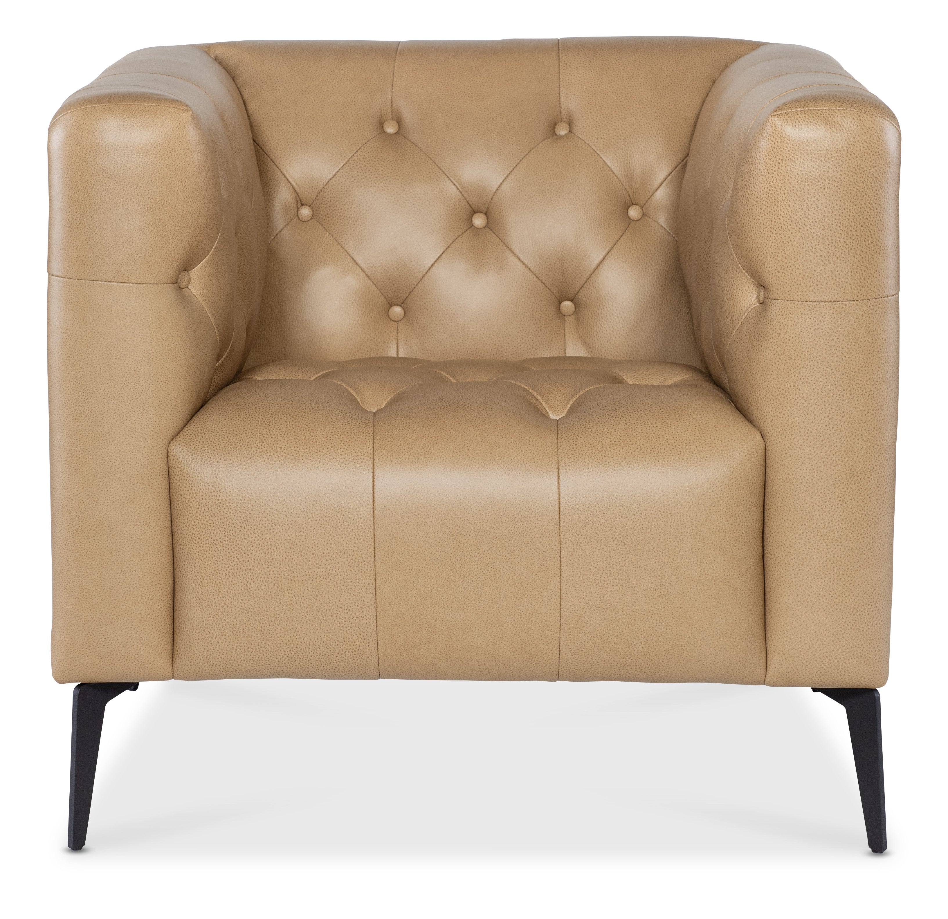 The Nicolla Stationary Chair in Baldwin Natural performance fabric offers a stylish, modern traditional design. With a chesterfield-inspired shelter arm design and button tufted interior, the chair stands out with its light, airy appearance, thanks to tall matte black metal tapered legs. The heathered two-tone sand-colored flat weave fabric provides durability and texture, making this chair a timeless addition to any living room.