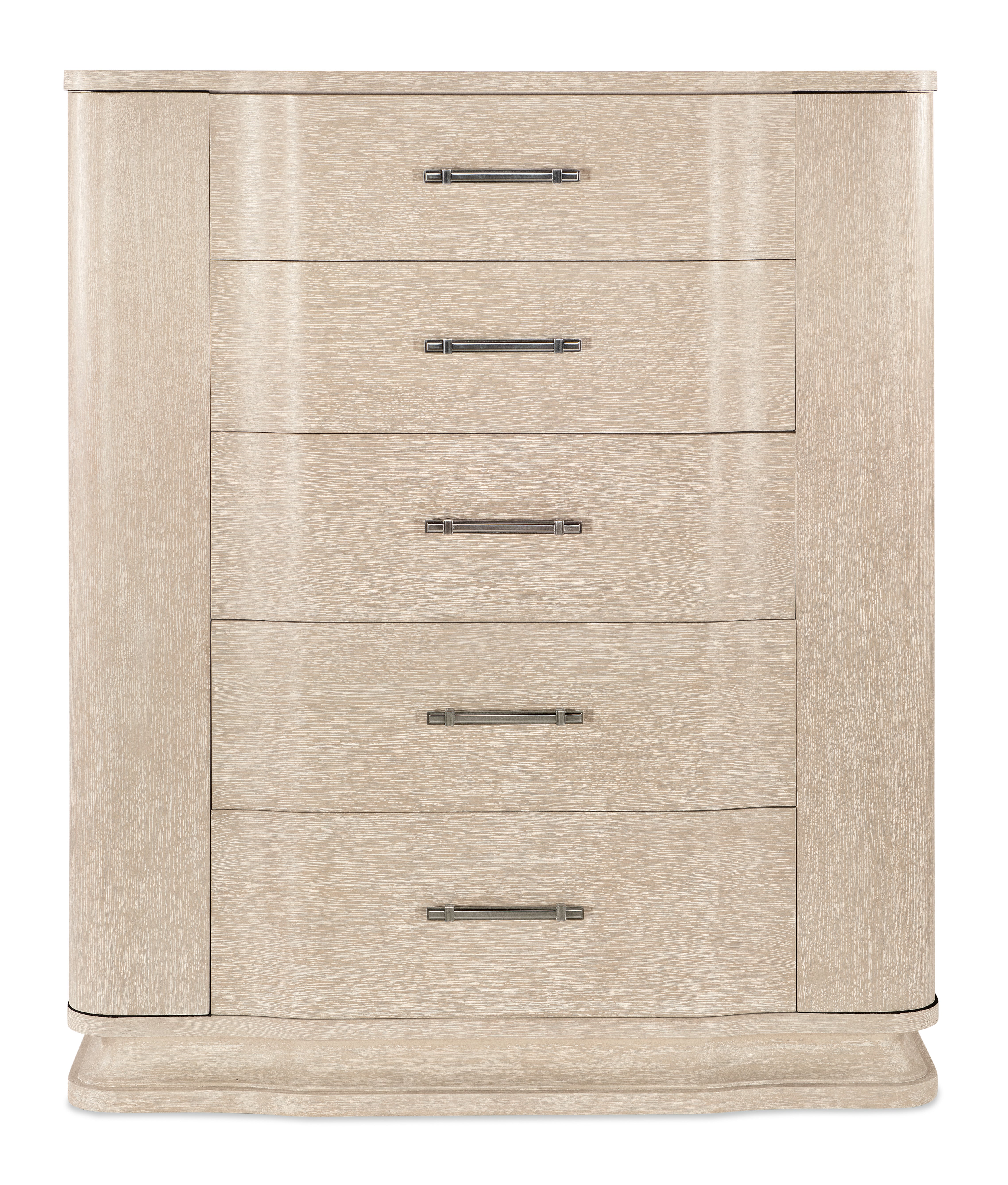 With a curved breakfront design and soft, flowing edges, the Nouveau Chic Five-Drawer Chest brings a clean neutral palette and casual modern style to your space. Crafted of Cathedral and Quartered Oak Veneers, it is finished in the serene Sandstone with light wire brushing. The stepped bracketed bar pulls in a nickel finish emulate the stepped-top dresser. A brilliant blend of fashion and function, the chest has two doors with soft-close hinges that open to reveal two felt-lined bars for hanging bracelets, 4 felt-lined fixed storage trays and 8 small black mesh bags and four large mesh bags for storing jewelry and other small items. Bottom drawer is cedar-lined.