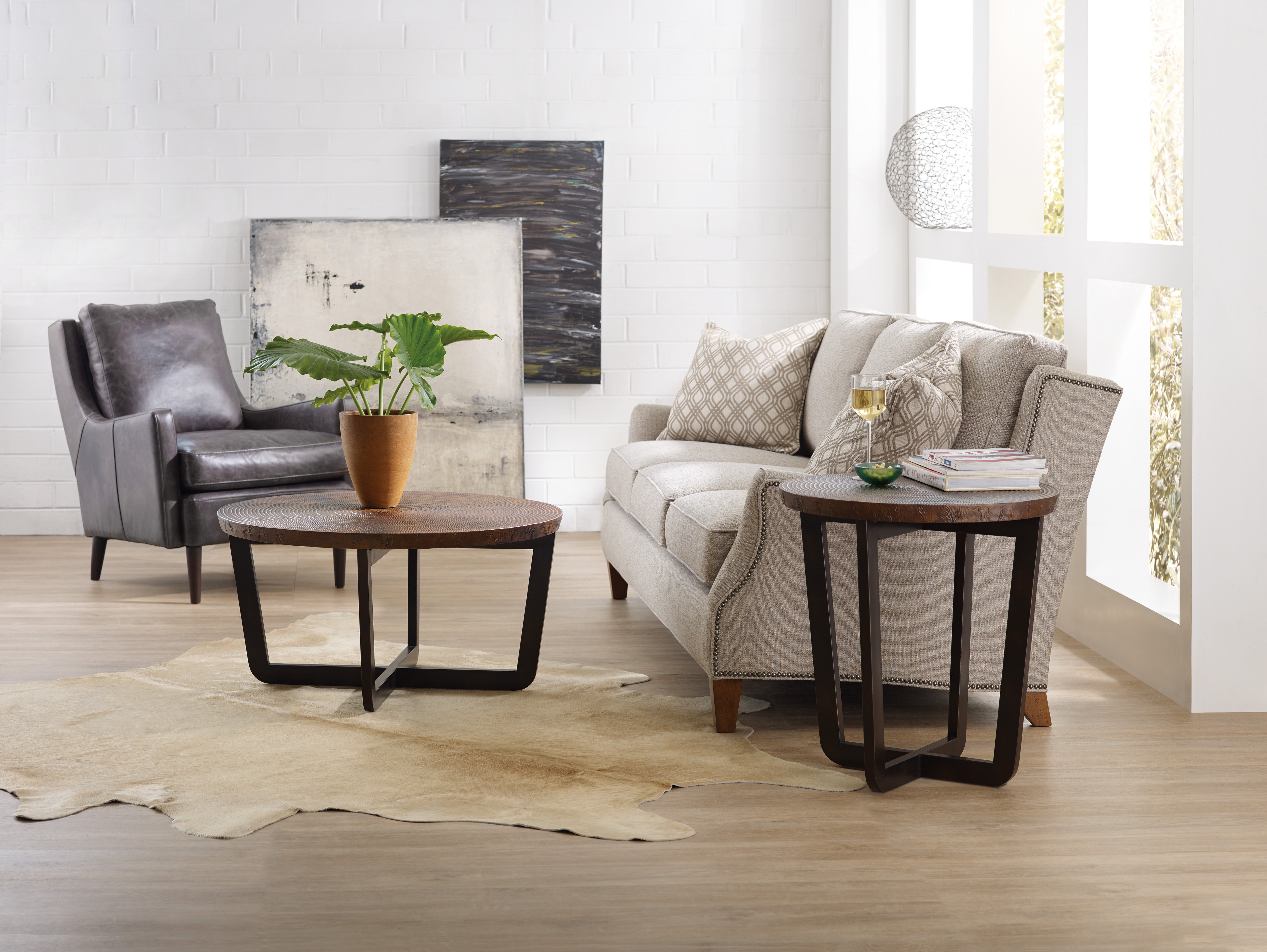 Rustic modern goes bold with the Parkcrest Round Cocktail Table, combining an aged copper top with a forged metal base in a dark finish for an earthy and casual appeal.