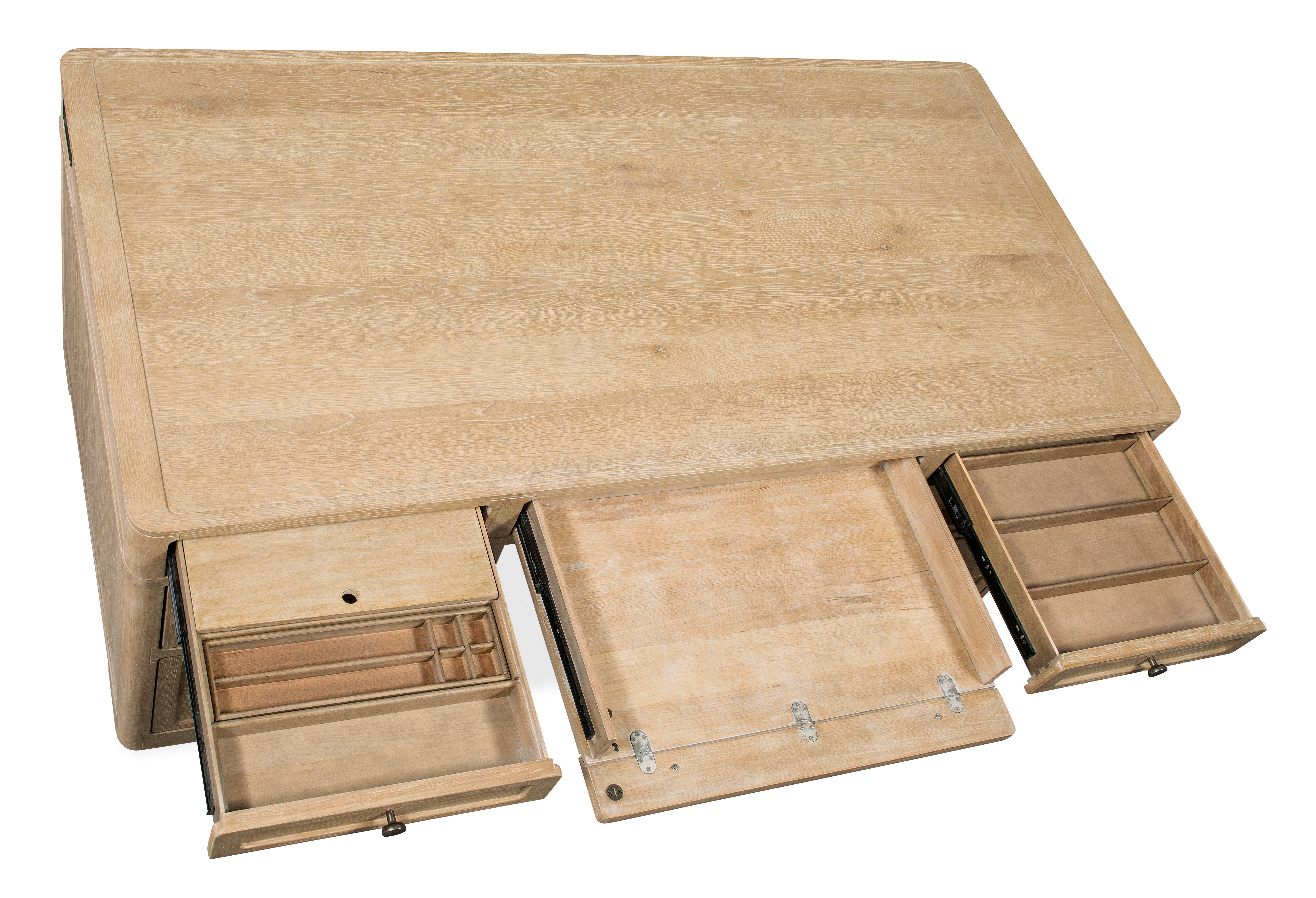 Left and right top drawers each have two removable dividers and one pencil tray and one writing slide that can be used on either side