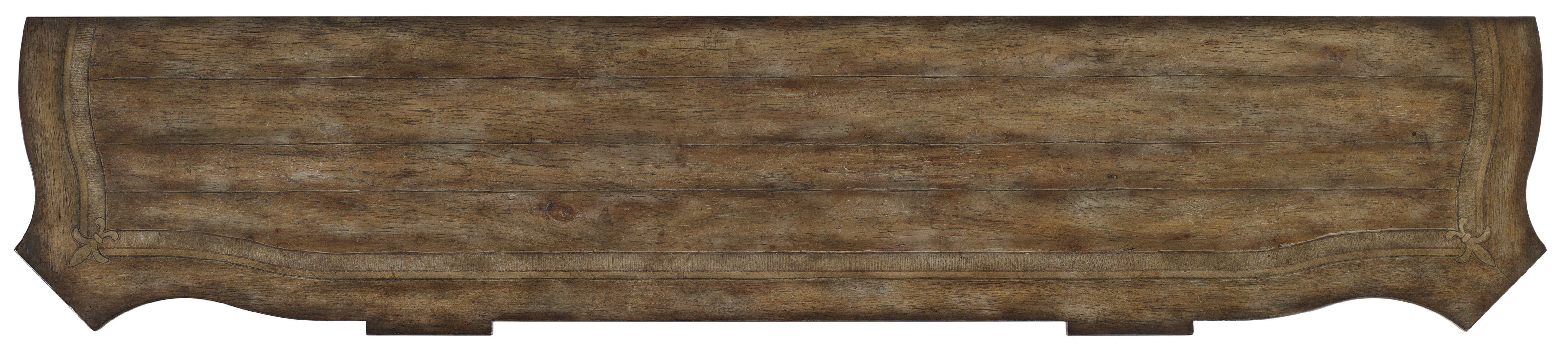 Finish: Walnut Colored Rustic Finish. Distressing includes scraping lines, sloping lines, rasping and wormholes. Hooker Furniture utilizes a multiple-step finish process of up to 16 finish steps. This results in an unsurpassed clarity, depth and color richness and durability to our finishes. Through hand-craftsmanship such as rubbing and padding, our finishes feel as good as they look, with a smoothness that is delightful to the touch. Hooker Furniture uses carefully chosen solid wood and select wood veneers over durable wood products in our furniture construction. Use of veneers enables more decorative looks unattainable with solid wood. Veneers are used over durable wood products such as medium density fiberboard (MDF) and particle board, made of renewable resources. MDF and particle board are used in quality furniture for areas that need to be stable, such as large surfaces. These durable wood products do not expand and contract with heat and cold and do not absorb moisture as much as solid wood, which results in stronger and longer-lasting furniture. Pecan, Hickory, Ash, Black Walnut and Maple Veneers with Resin We recommend dusting frequently with a clean, soft, dry, lint-free cloth. Clean the surface by rubbing in the direction of the grain. We recommend polishing your furniture approximately every six months using a clean, soft, lint-free cloth and rubbing the polish in the direction of the grain. Guardsman furniture polish or any furniture polish that doesn't contain silicone is recommended. Hooker Furniture offers full height, full depth and full width drawers for maximum storage capacity. All drawers have strong, time-tested English or French dovetail construction, for years of problem-free use. Plywood drawer bottoms are attached to plywood drawer sides for strength and durability. Metal side guides or wood on wood guide systems operate smoothly. Dimension (LxWxH):20.00 x 96.00 x 44.50