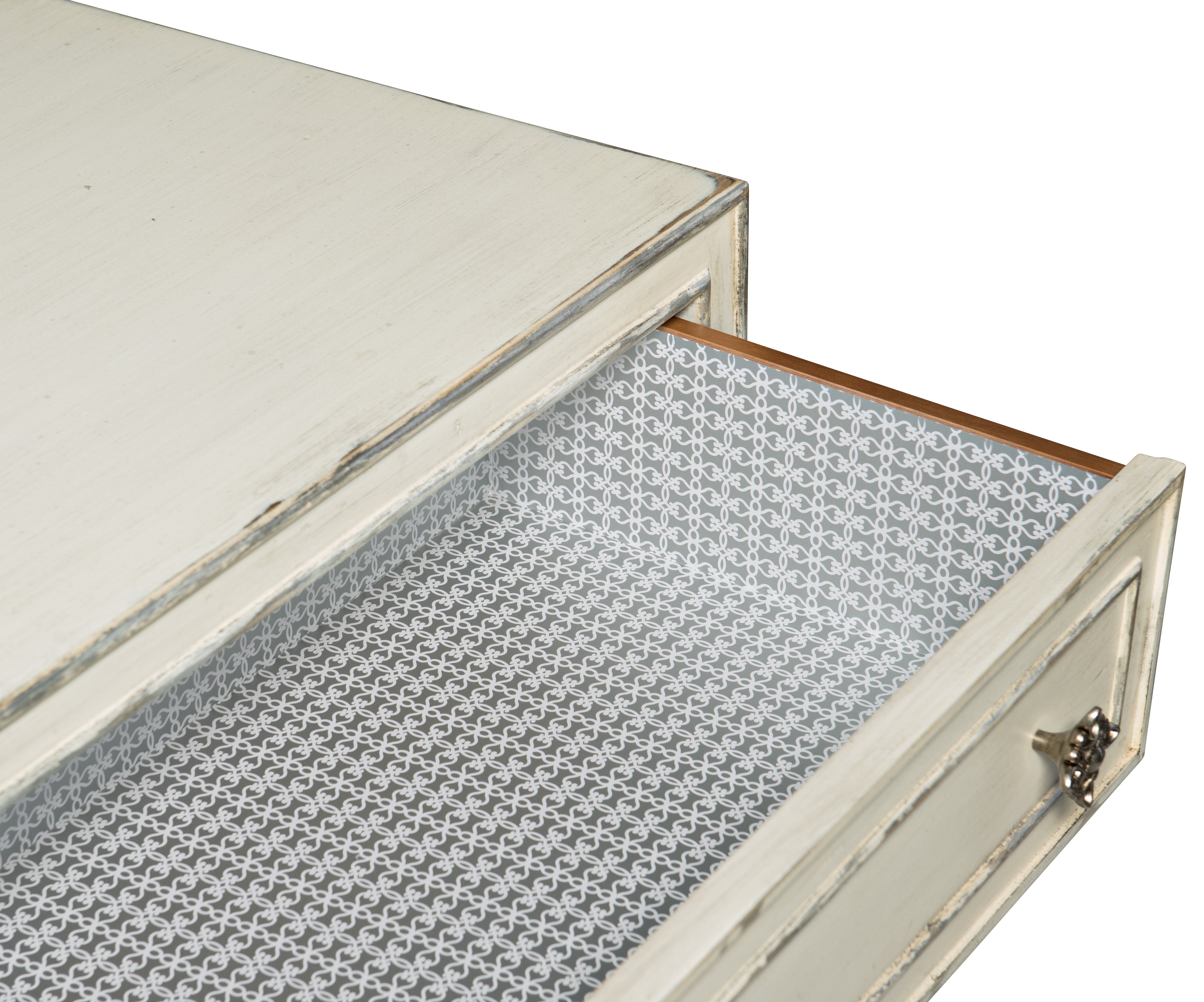 Just add candlelight. With clean lines and a creamy white finish accented with champagne and silver tipping, the Anastasie Dresser is refined elegance with a whisper of Hollywood glamour. As practical as it is pretty, the nine-drawer dresser has a top center drawer with a drop front and a right top drawer with a drop-in felt-lined jewelry tray. The bottom 3 drawers are cedar-lined, and the top 3 drawers are lined with gray and white designer wallpaper.