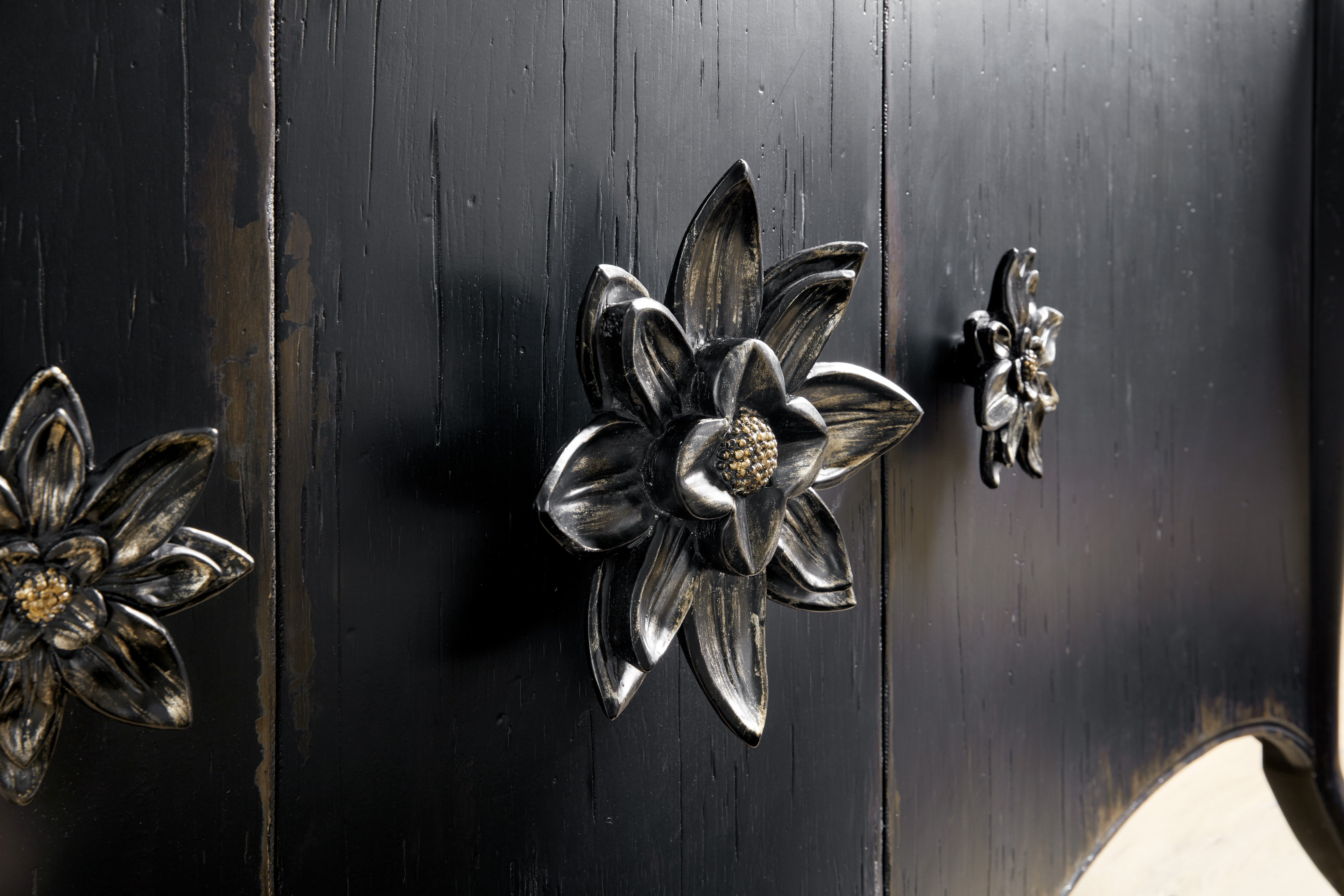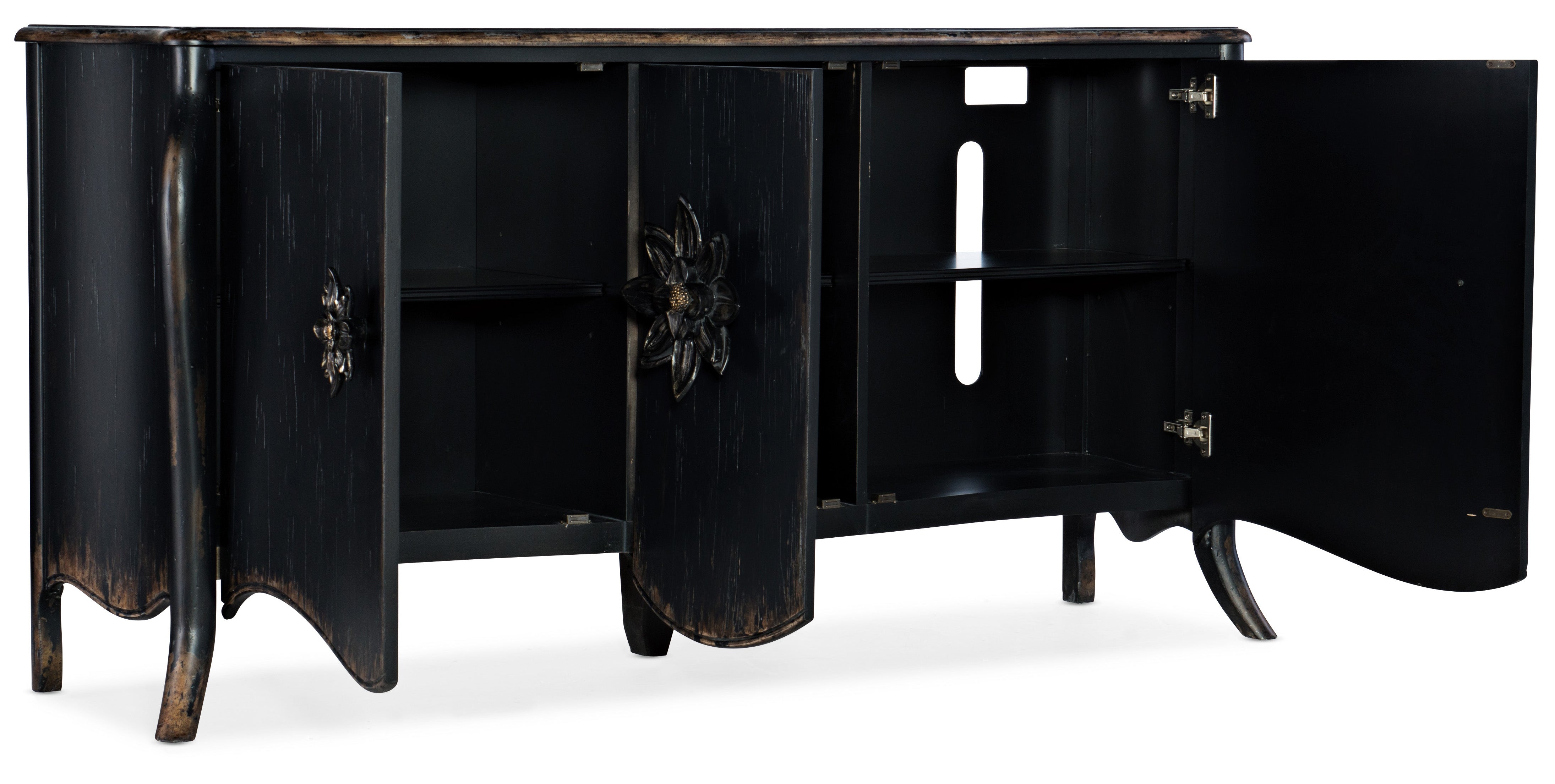Absolutely captivating, the Bien Ame Buffet is a luxurious piece that is approachable and inviting. With classic bones, the 3-door buffet features a shaped apron and cabriole legs and delightful decorative floral hardware. Crafted of Poplar and Hardwood Solids with Oak Veneers, it is finished in Porte Noir, a black paint with rich brown undertones with areas of heavy rub through and distressing to reveal a honey tone wood color. Doors have soft-close hinges, and there is one adjustable shelf behind each door.