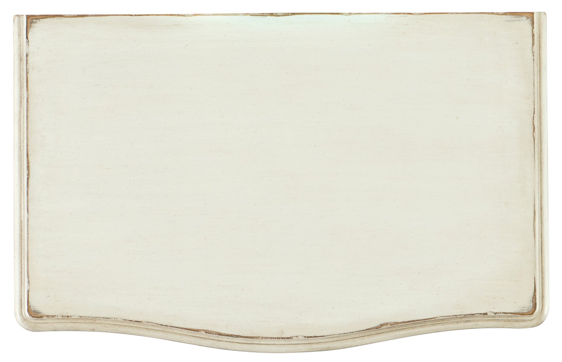 Levelers Finish: Blanc, a creamy white finish accented with champagne and silver tipping. Distressing includes drawknife, wormholes and stoning. Antique silver colored metal alloy custom decorative pull designed to look like a piece of jewelry. Hooker Furniture utilizes a multiple-step finish process of up to 16 finish steps. This results in an unsurpassed clarity, depth and color richness and durability to our finishes. Through hand-craftsmanship such as rubbing and padding, our finishes feel as good as they look, with a smoothness that is delightful to the touch. Hooker Furniture uses carefully chosen solid wood and select wood veneers over durable wood products in our furniture construction. Use of veneers enables more decorative looks unattainable with solid wood. Veneers are used over durable wood products such as medium density fiberboard (MDF) and particle board, made of renewable resources. MDF and particle board are used in quality furniture for areas that need to be stable, such as large surfaces. These durable wood products do not expand and contract with heat and cold and do not absorb moisture as much as solid wood, which results in stronger and longer-lasting furniture. Oak Veneers, Resin with Cedar We recommend dusting frequently with a clean, soft, dry, lint-free cloth. Clean the surface by rubbing in the direction of the grain. We recommend polishing your furniture approximately every six months using a clean, soft, lint-free cloth and rubbing the polish in the direction of the grain. Guardsman furniture polish or any furniture polish that doesn't contain silicone is recommended. Hooker Furniture offers full height, full depth and full width drawers for maximum storage capacity. All drawers have strong, time-tested English or French dovetail construction, for years of problem-free use. Plywood drawer bottoms are attached to plywood drawer sides for strength and durability. Metal side guides or wood on wood guide systems operate smoothly. Dimension (LxWxH):19.00 x 30.00 x 30.00