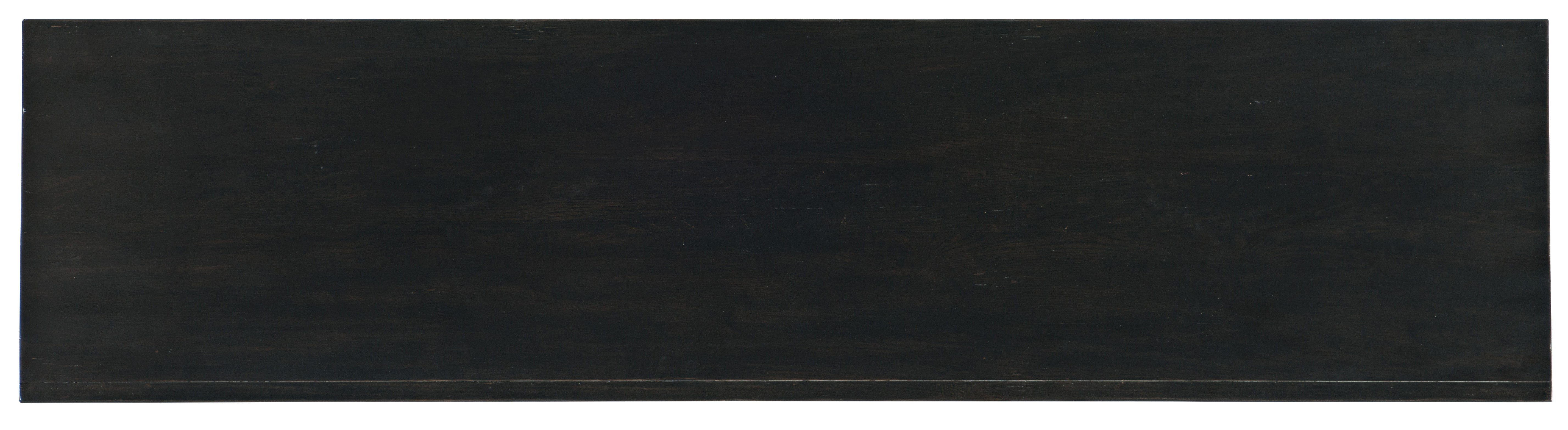 Levelers Finish: Noir: a dark, black painted finish with rich brown undertones, rubbed to a medium sheen. Distressing includes drawknife, wormholes and rasping. Hooker Furniture utilizes a multiple-step finish process of up to 16 finish steps. This results in an unsurpassed clarity, depth and color richness and durability to our finishes. Through hand-craftsmanship such as rubbing and padding, our finishes feel as good as they look, with a smoothness that is delightful to the touch. Hooker Furniture uses carefully chosen solid wood and select wood veneers over durable wood products in our furniture construction. Use of veneers enables more decorative looks unattainable with solid wood. Veneers are used over durable wood products such as medium density fiberboard (MDF) and particle board, made of renewable resources. MDF and particle board are used in quality furniture for areas that need to be stable, such as large surfaces. These durable wood products do not expand and contract with heat and cold and do not absorb moisture as much as solid wood, which results in stronger and longer-lasting furniture. Oak Veneers and Glass We recommend dusting frequently with a clean, soft, dry, lint-free cloth. Clean the surface by rubbing in the direction of the grain. We recommend polishing your furniture approximately every six months using a clean, soft, lint-free cloth and rubbing the polish in the direction of the grain. Guardsman furniture polish or any furniture polish that doesn't contain silicone is recommended. Dimension (LxWxH):20.75 x 79.75 x 34.00