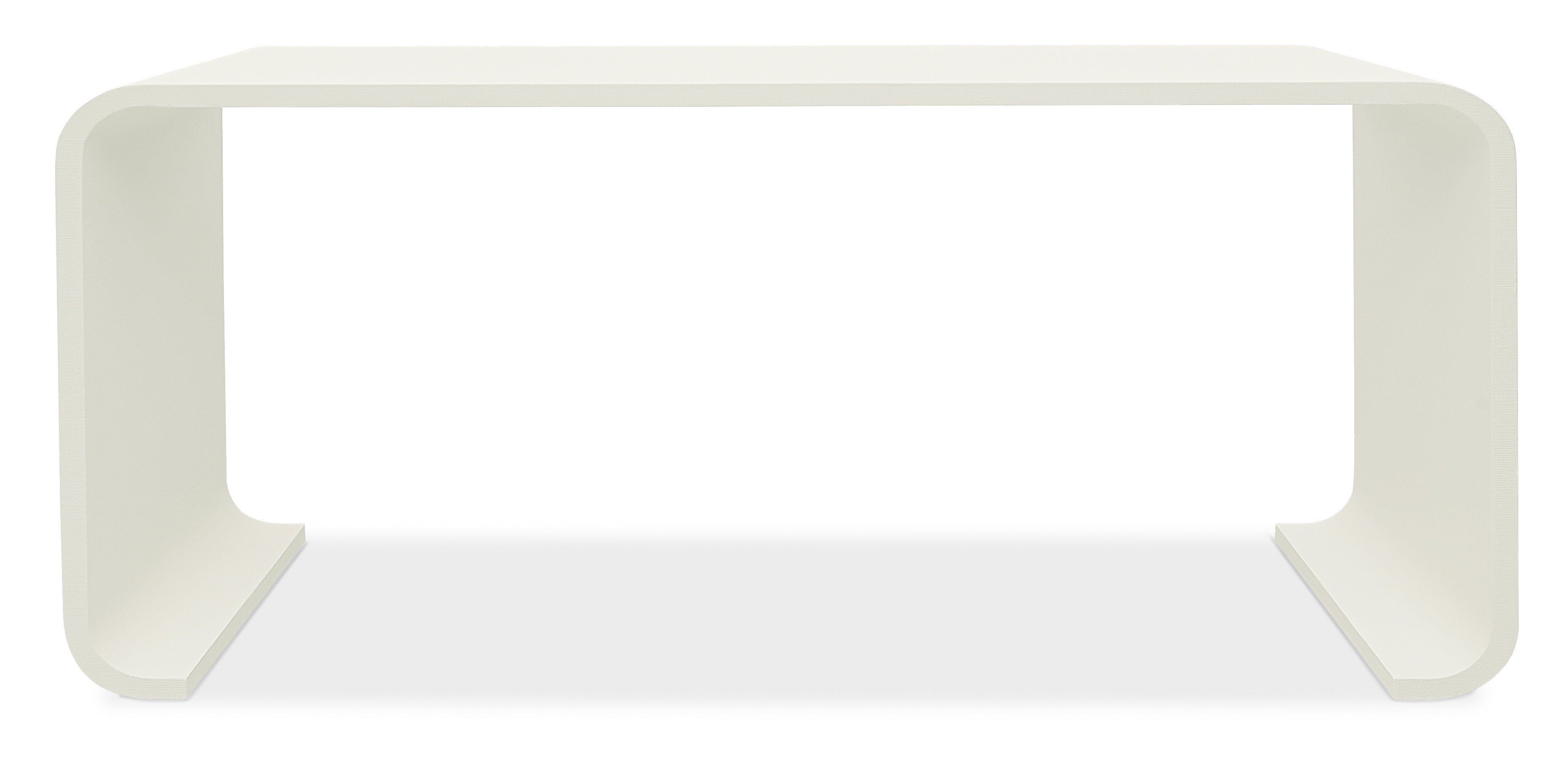 Soft, modern and organic, the Kai Console Table in a rounded rectangle shape is crafted of Wood and Raffia in the soothing Sand Dollar finish, a white lacquered grasscloth to create a spa-like ambience. At only 14 inches deep, this striking piece fits well even in narrow spaces.