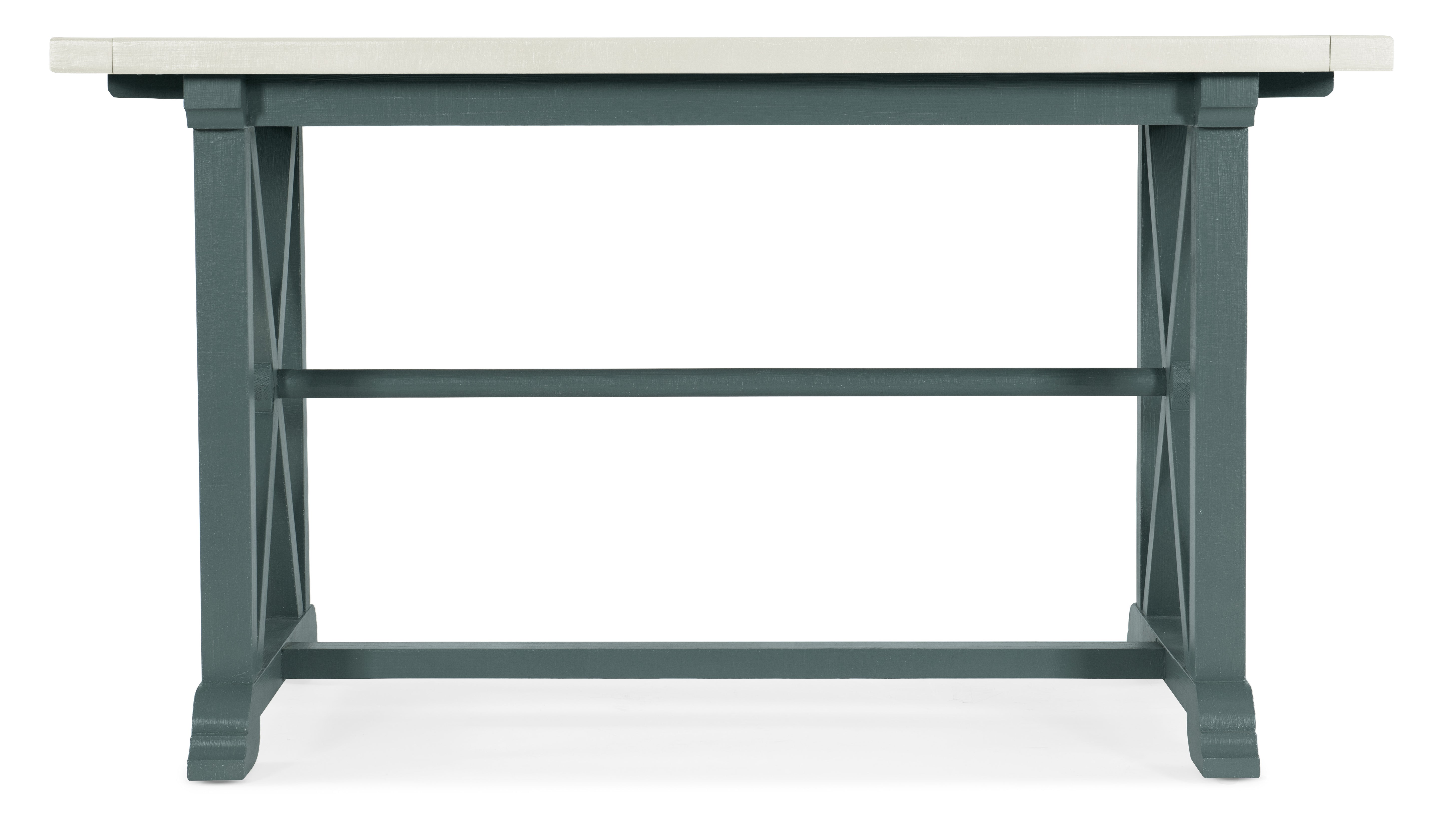 X-motif base Finish: Top: Shell, a soft, textured sandblasted white finish. Base: Seaspray: brush textured blue finish. Hooker Furniture utilizes a multiple-step finish process of up to 16 finish steps. This results in an unsurpassed clarity, depth and color richness and durability to our finishes. Through hand-craftsmanship such as rubbing and padding, our finishes feel as good as they look, with a smoothness that is delightful to the touch. Hooker Furniture uses carefully chosen solid wood and select wood veneers over durable wood products in our furniture construction. Use of veneers enables more decorative looks unattainable with solid wood. Veneers are used over durable wood products such as medium density fiberboard (MDF) and particle board, made of renewable resources. MDF and particle board are used in quality furniture for areas that need to be stable, such as large surfaces. These durable wood products do not expand and contract with heat and cold and do not absorb moisture as much as solid wood, which results in stronger and longer-lasting furniture. Oak Veneers, Resin and Solid-Wood Edge Top We recommend using coasters, placements and trivets when using hot containers with this item. It is also recommended to provide quick cleanup for any spills to minimize exposure to moisture. Doing so will prolong the life and look of the item and provide many years of the quality you expect. Dimension (LxWxH):32.00 x 64.00 x 36.25