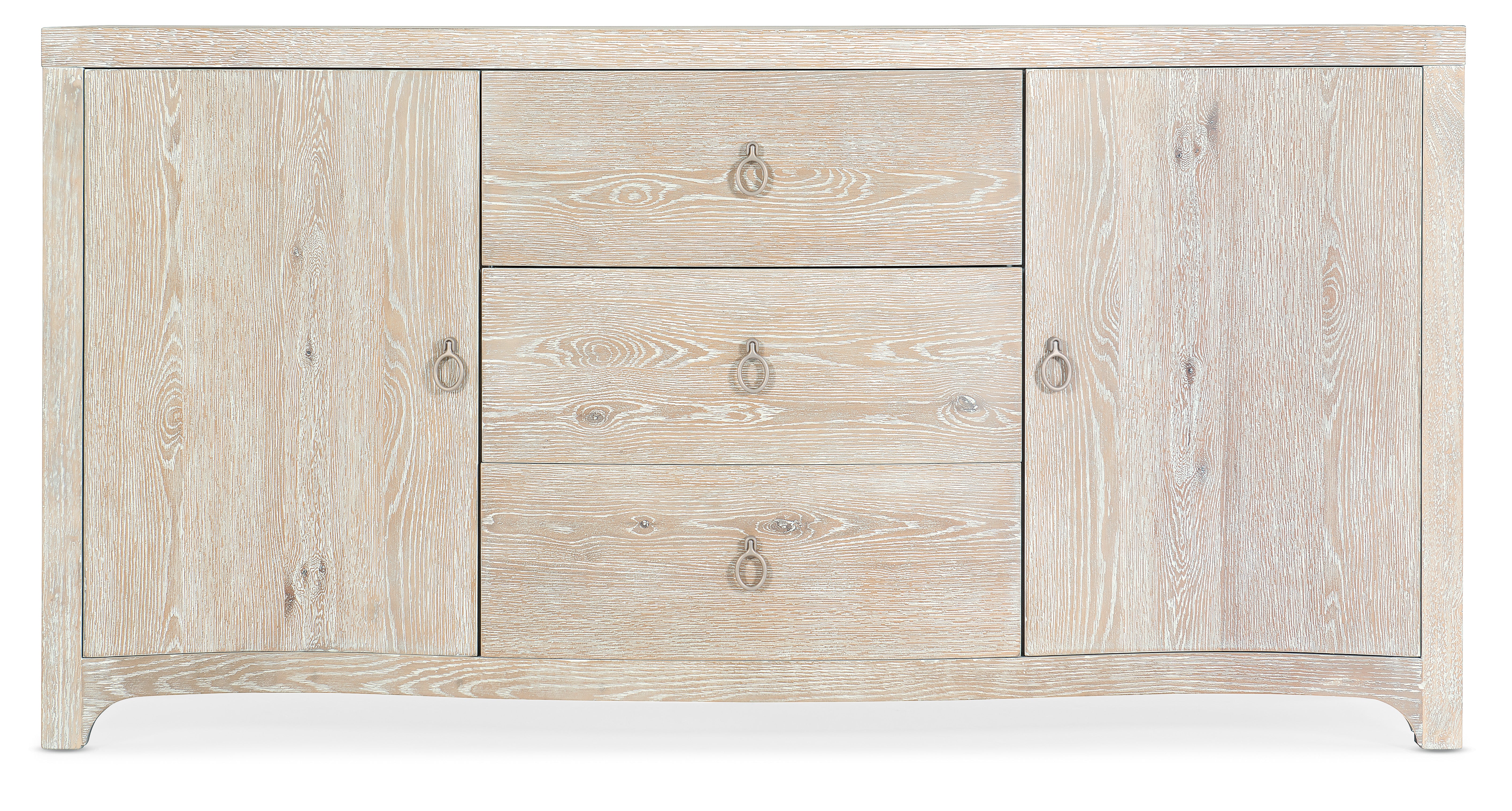 In a light and airy whitewashed and wire brushed oak finish and a soft serpentine-shaped case, the Serenity Buffet brings the relaxed aura of the outside in. The buffet has 2 doors with soft-close hinges and 3 drawers with soft-close drawer guides. The top drawer has a removable black felt silverware tray, and there are 2 adjustable shelves behind each door. Champagne drawer pulls add a sophisticated touch.