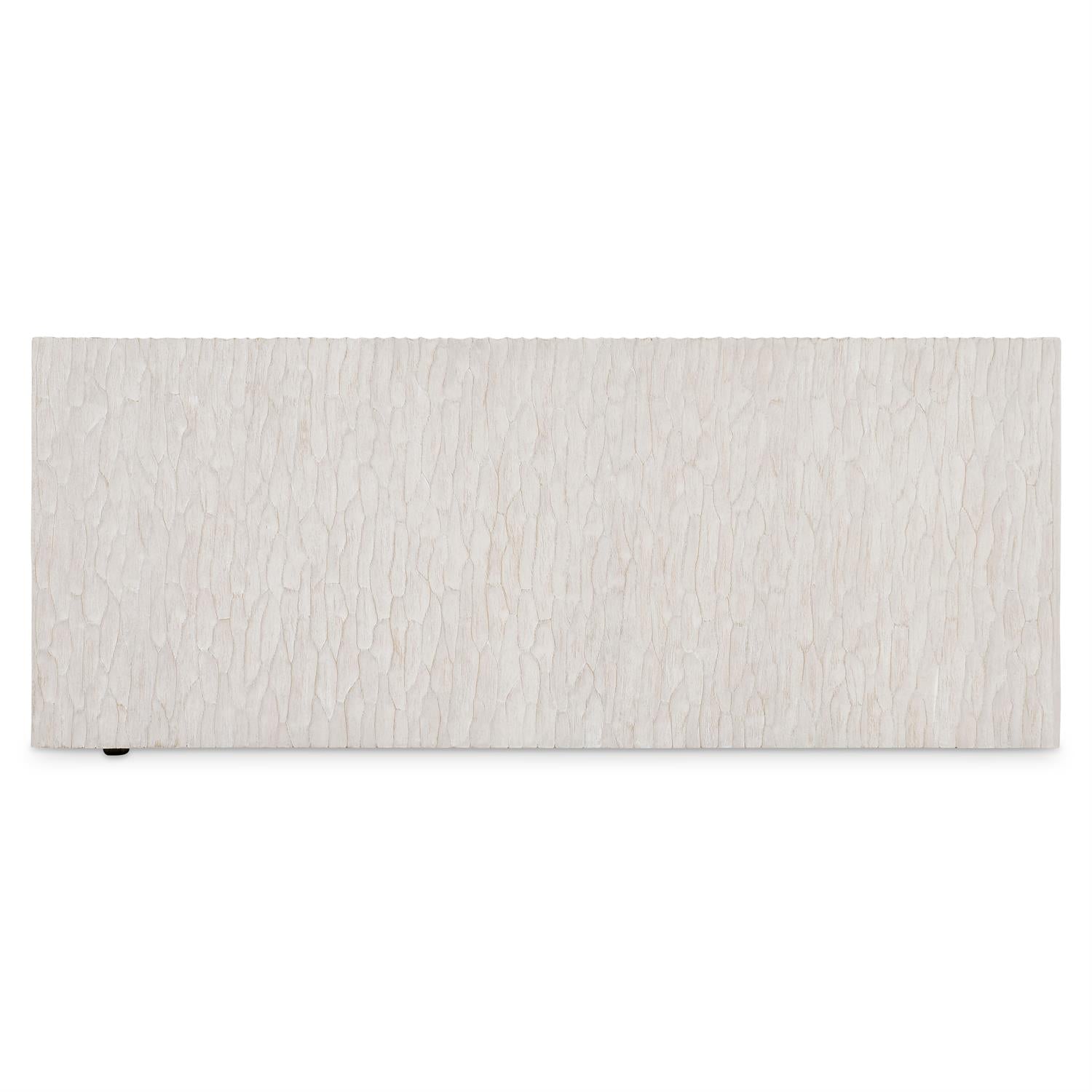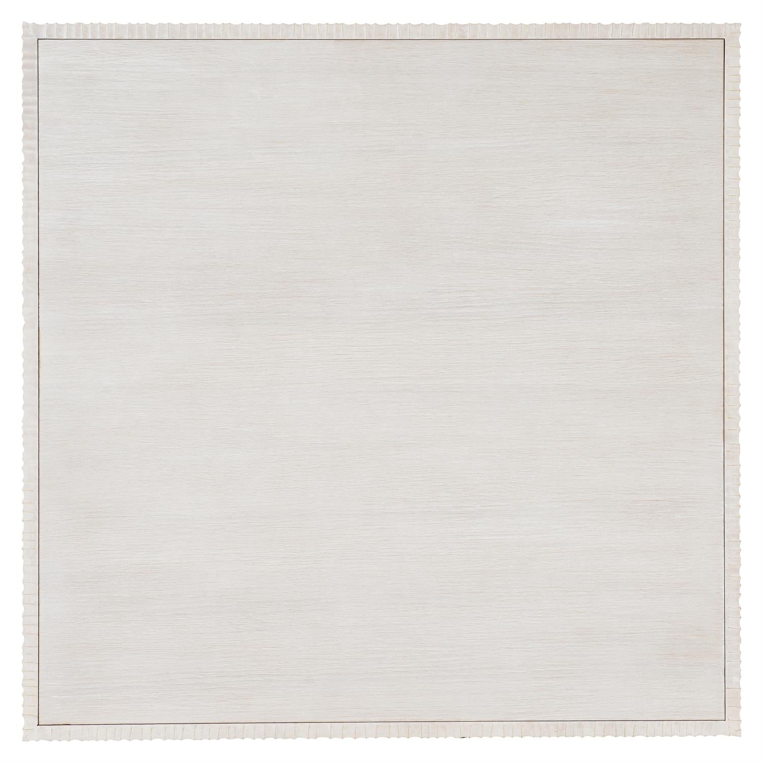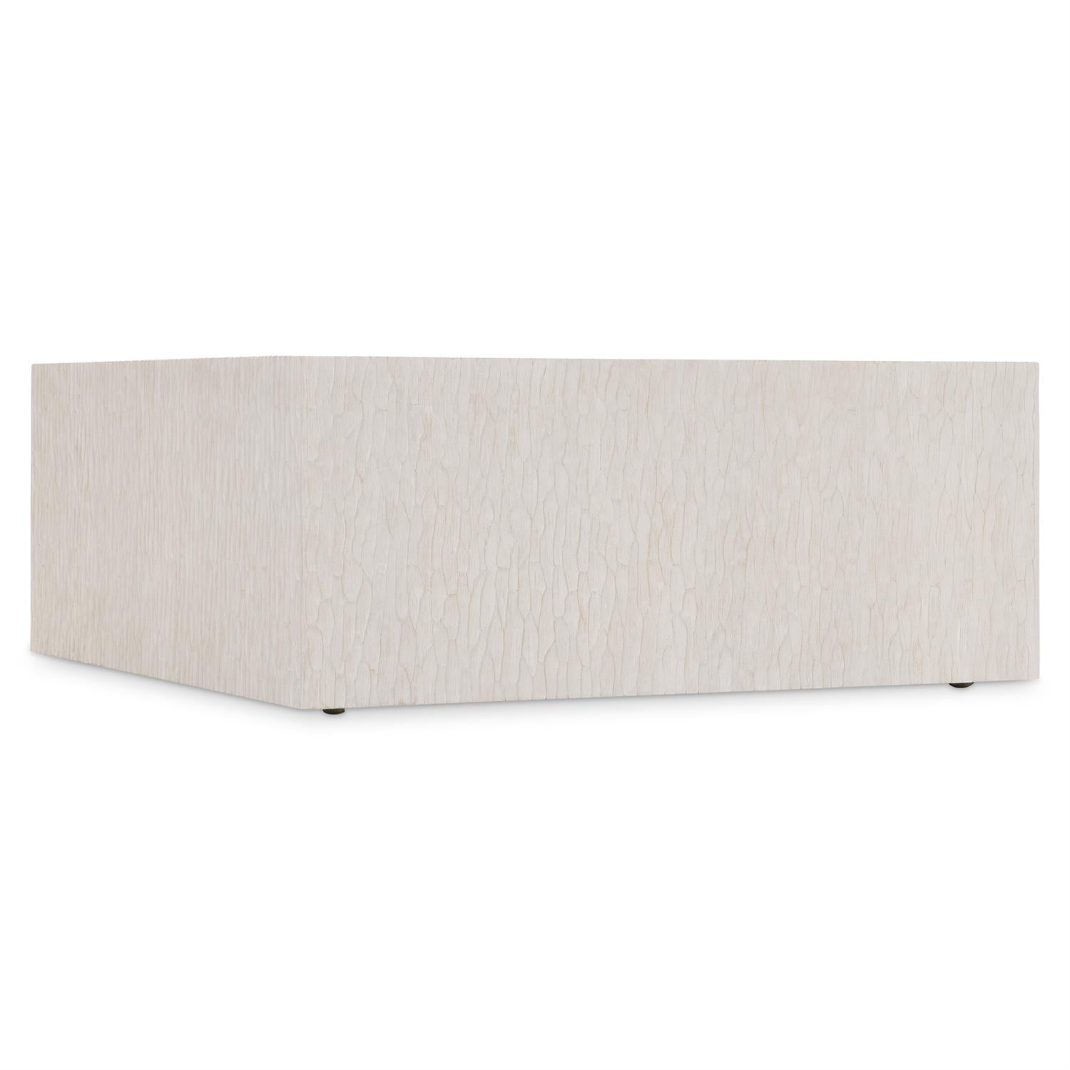 The square Solaria cocktail table softens the look of rough-hewn wood with a chiseled resin frame in a Weathered Bone finish. An inset wooden frame coordinates in the same finish. The expansive table is 44 inches on each side, giving it a substantial appearance, with hidden casters offering mobility.