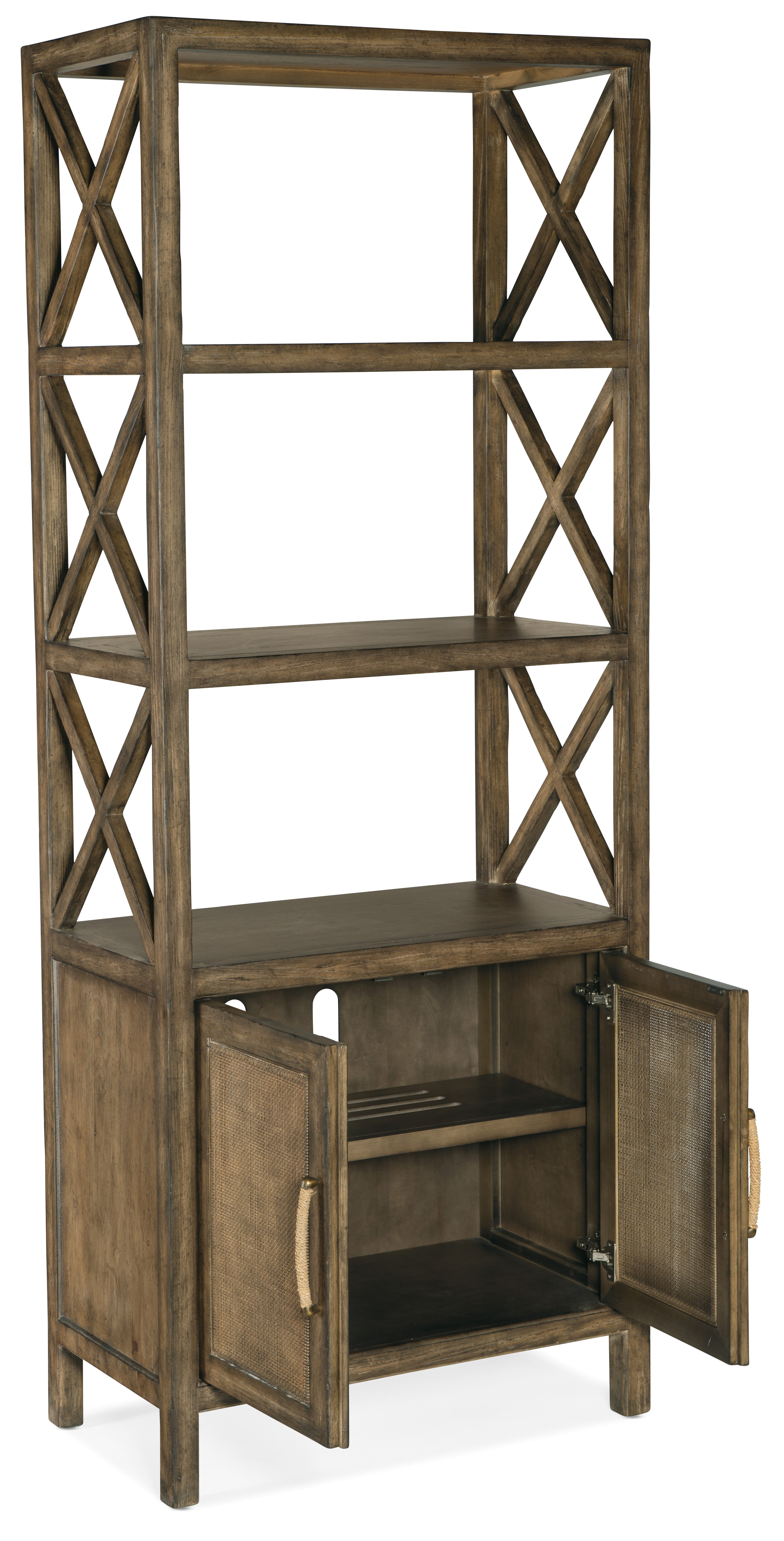 Create a resort-inspired retreat with the Sundance Entertainment Pier, featuring 2 rattan-front doors complementing a wood frame crafted of Pecan Veneers finished in the rich brown Cliffside with light burnishing on the edges. The laid-back vibe of this California casual-inspired piece is enhanced by X motifs on the sides of the shelves. Behind the doors is one adjustable vented shelf, and two fixed shelves. This piece is designed to bunch with coordinating with the 6015-55465-89 Sundance Entertainment Console full entertainment wall, and can be used alone.