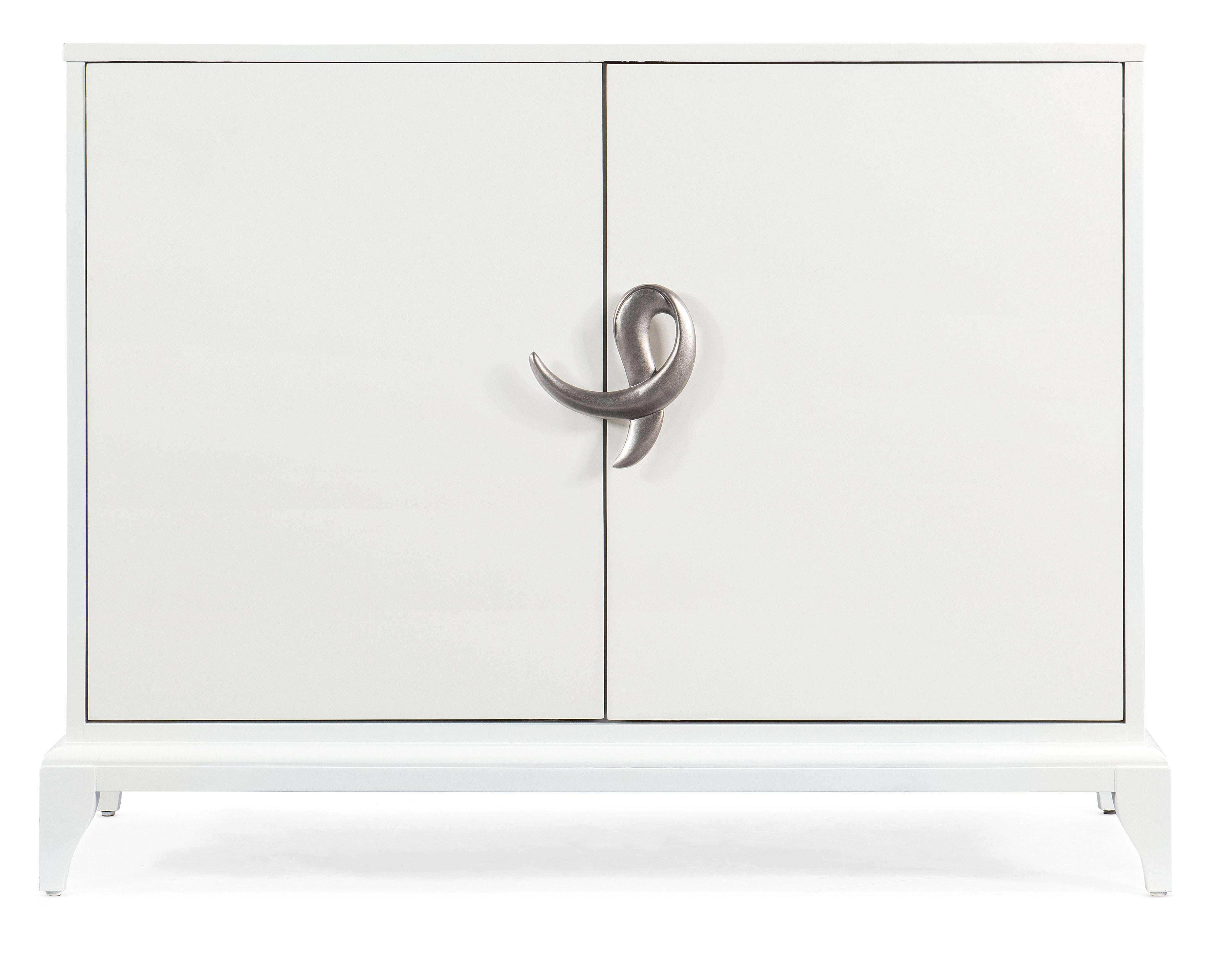 Sleek and modern meets soft and soothing with the Unity Chest. Part of a curated collection to honor the spirit and courage of those diagnosed with breast cancer, the chest contrasts a creamy white exterior with a magenta-colored interior, accented by antique pewter ribbon-designed hardware. The two doors have soft-close hinges and one adjustable shelf behind each. Crafted of Maple Veneers, a portion of the proceeds from each chest sold goes to the Susan G. Komen Foundation.