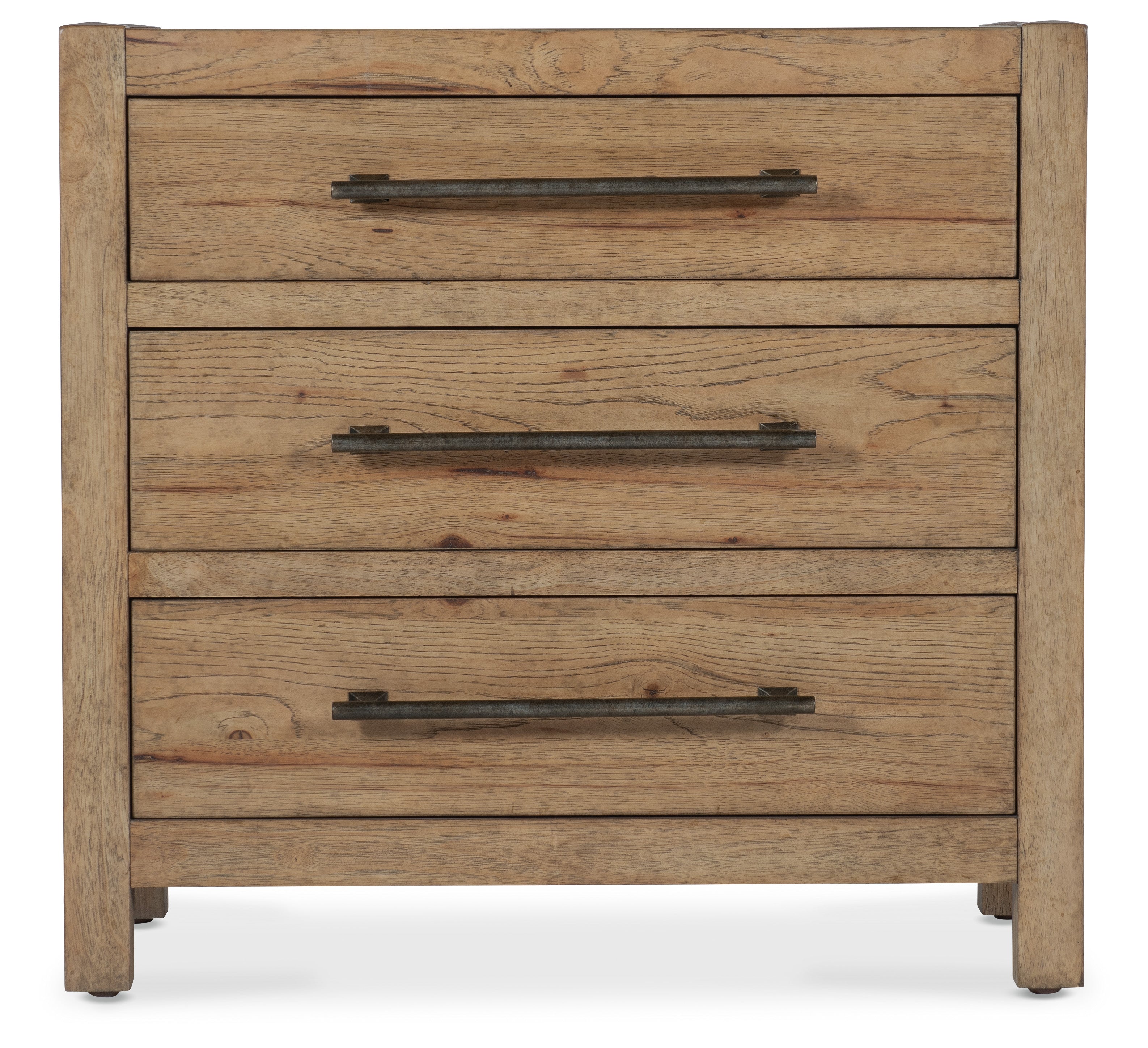 Top drawer has removable black felt liner Finish: Sonoma: a light and airy vibe, reminiscent of the crisp white wines of the Sonoma region. Rustic, hammered bar pulls. Hooker Furniture utilizes a multiple-step finish process of up to 16 finish steps. This results in an unsurpassed clarity, depth and color richness and durability to our finishes. Through hand-craftsmanship such as rubbing and padding, our finishes feel as good as they look, with a smoothness that is delightful to the touch. Hooker Furniture uses carefully chosen solid wood and select wood veneers over durable wood products in our furniture construction. Use of veneers enables more decorative looks unattainable with solid wood. Veneers are used over durable wood products such as medium density fiberboard (MDF) and particle board, made of renewable resources. MDF and particle board are used in quality furniture for areas that need to be stable, such as large surfaces. These durable wood products do not expand and contract with heat and cold and do not absorb moisture as much as solid wood, which results in stronger and longer-lasting furniture. Pecky Hickory and White Oak Veneers We recommend dusting frequently with a clean, soft, dry, lint-free cloth. Clean the surface by rubbing in the direction of the grain. We recommend polishing your furniture approximately every six months using a clean, soft, lint-free cloth and rubbing the polish in the direction of the grain. Guardsman furniture polish or any furniture polish that doesn't contain silicone is recommended. Hooker Furniture offers full height, full depth and full width drawers for maximum storage capacity. All drawers have strong, time-tested English or French dovetail construction, for years of problem-free use. Plywood drawer bottoms are attached to plywood drawer sides for strength and durability. Metal side guides or wood on wood guide systems operate smoothly. Dimension (LxWxH):18.00 x 34.00 x 32.00