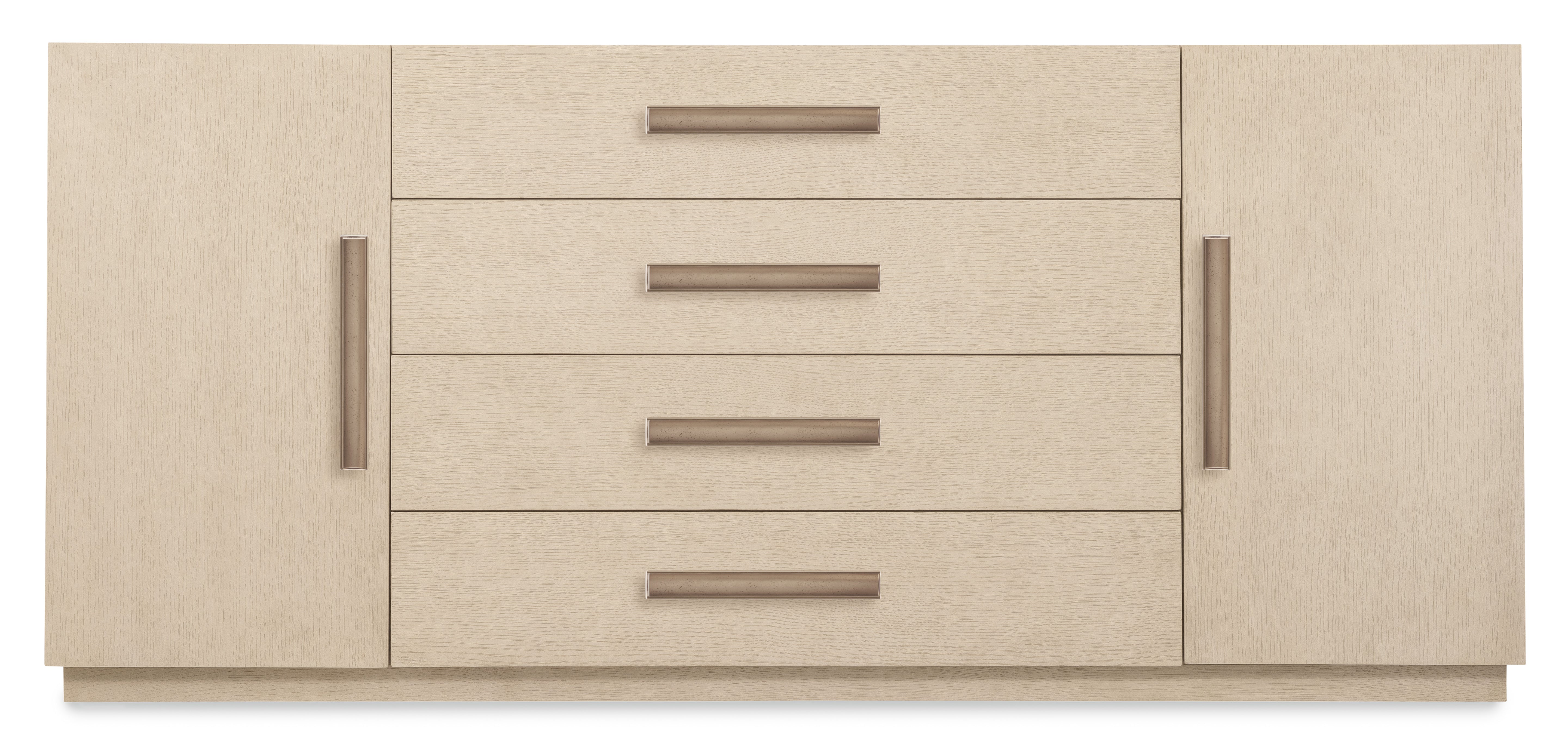 The Westwood Buffet offers understated luxury with practical storage. Featuring four center drawers, two doors with adjustable shelves, and a silverware tray, this buffet is ideal for organizing your dining essentials. The Polished Limestone finish on quartered oak veneers, along with custom bar hardware, brings modern elegance to any dining room. Perfect for those who value both style and functionality.
